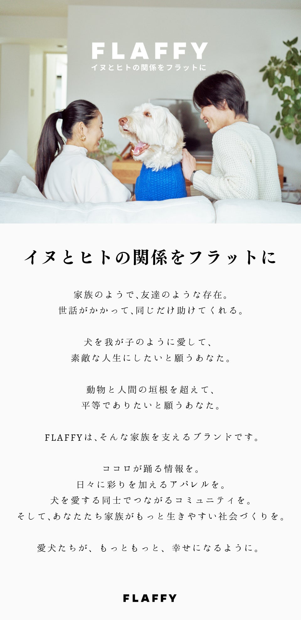FLAFFY(フラッフィ)とは「イヌとヒトの関係をもっとフラットにしたい」そんな想いで生まれたブランドです。