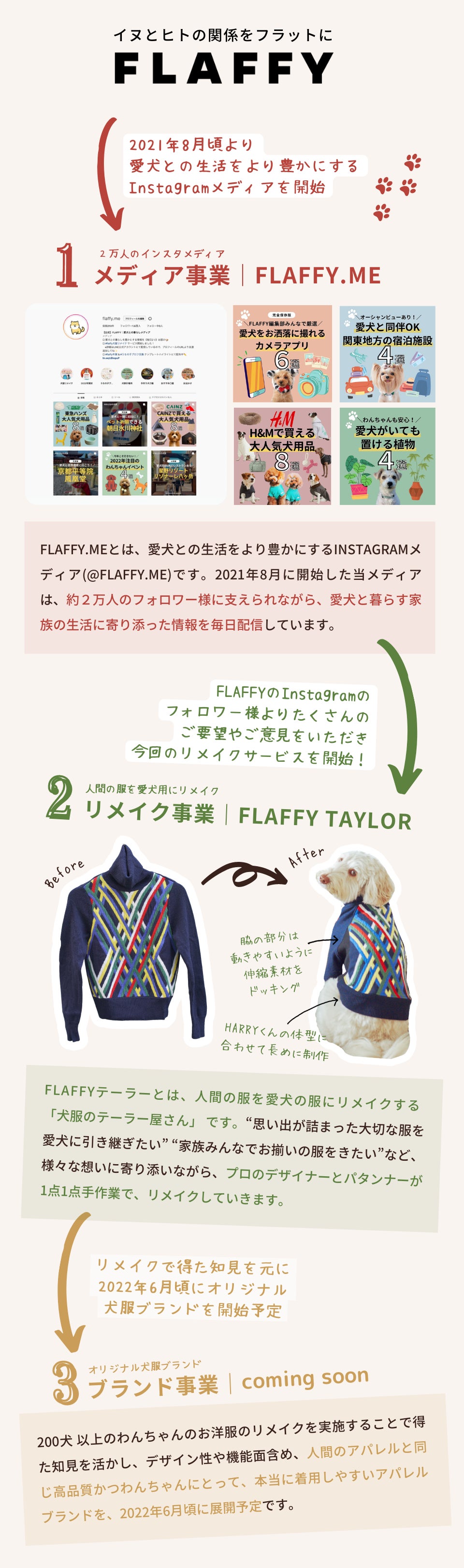 FLAFFYでは、"イヌとヒトの関係をフラットに " というコンセプトを実現するために、下記3つのサービスの展開をしていきます。