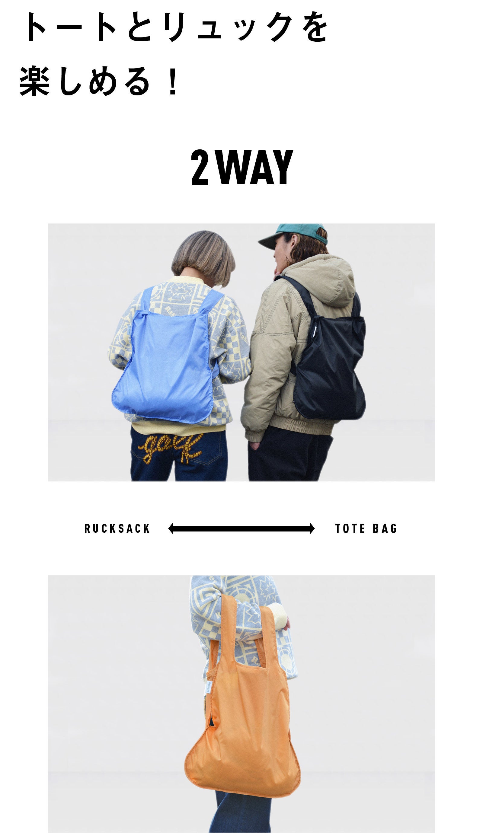難しい操作は必要ありません。ベルトの上を引っ張ればトート。ベルトの真ん中を引っ張ればリュックに早変わり。だから様々なシチュエーションで大活躍します。