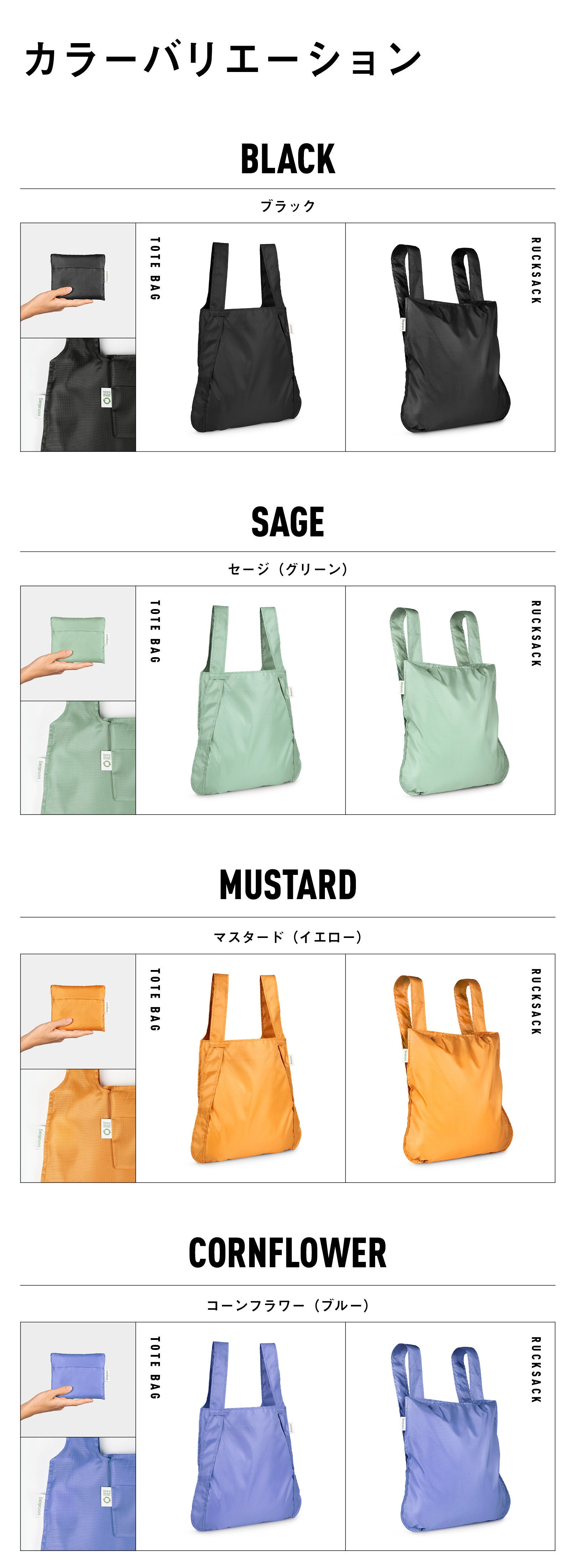Notabag Recycledコレクションは以下の美しい4色で展開されており、それぞれが、私たちの選択が持つ力を思い出させてくれます。