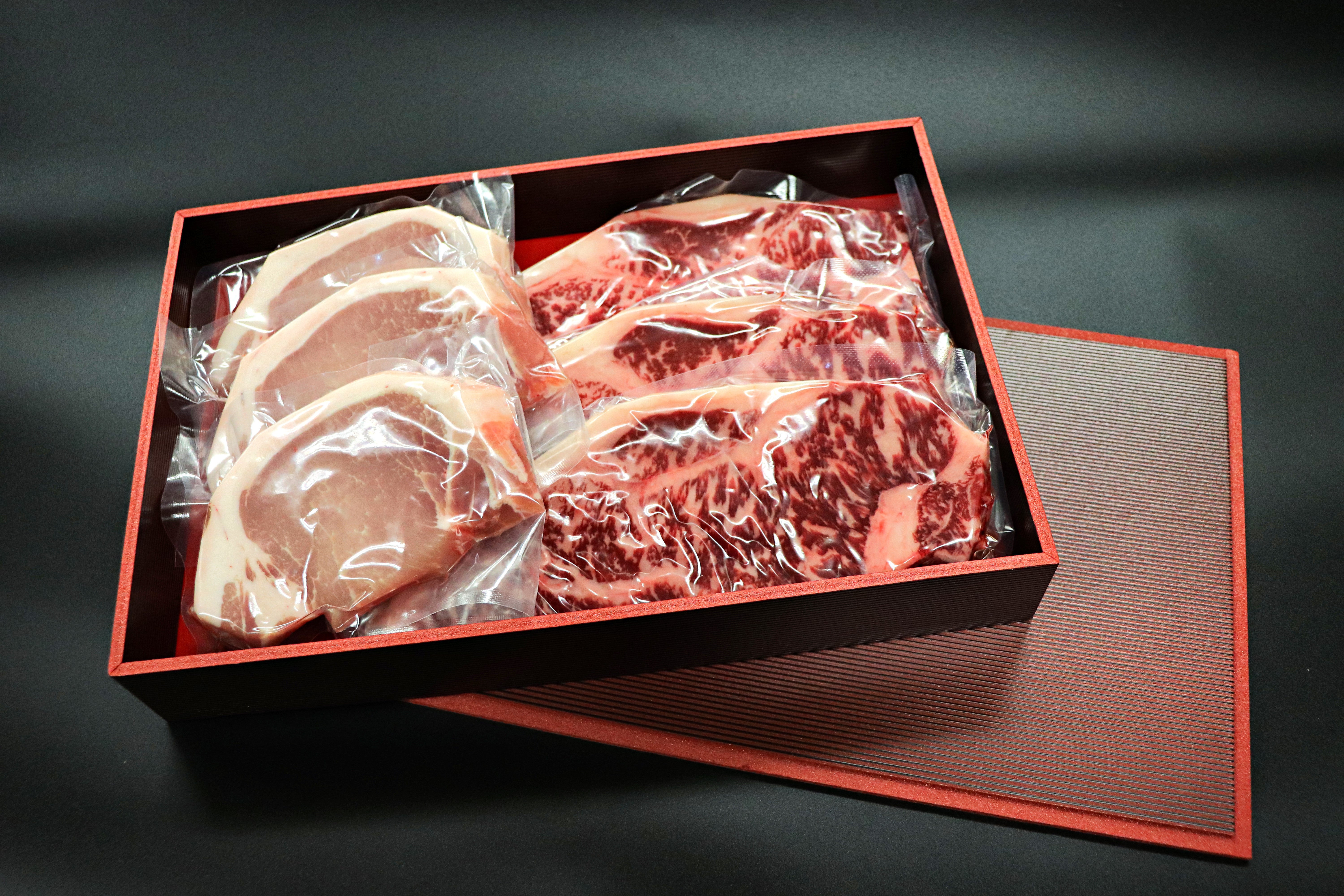 内容量:赤城牛サーロイン1枚300g×3枚、やまと豚ロース1枚150g×3枚