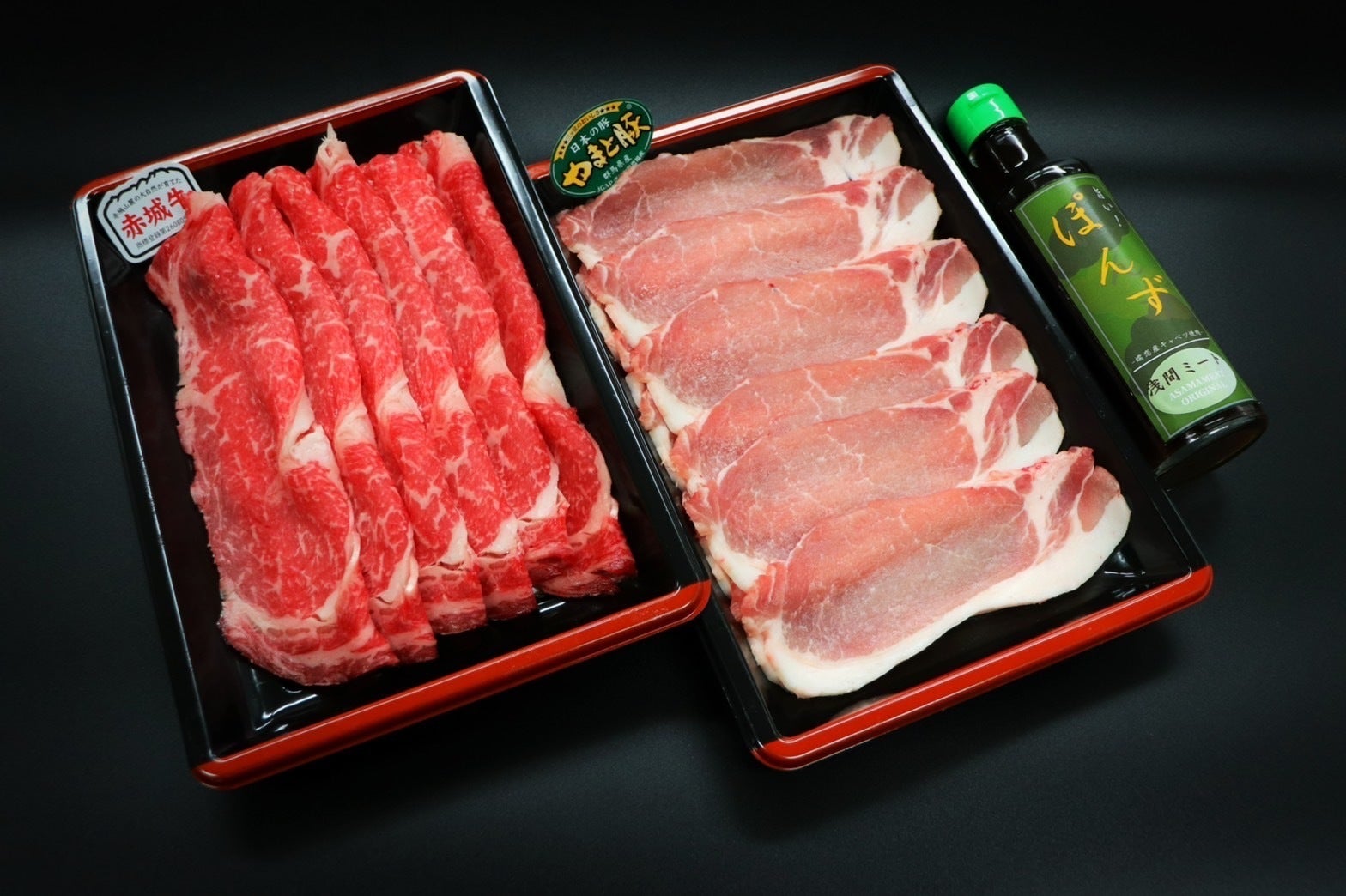 赤城牛リブロース(400g)、やまと豚ロース(500g)、オリジナルポン酢(1本)のセットになります。