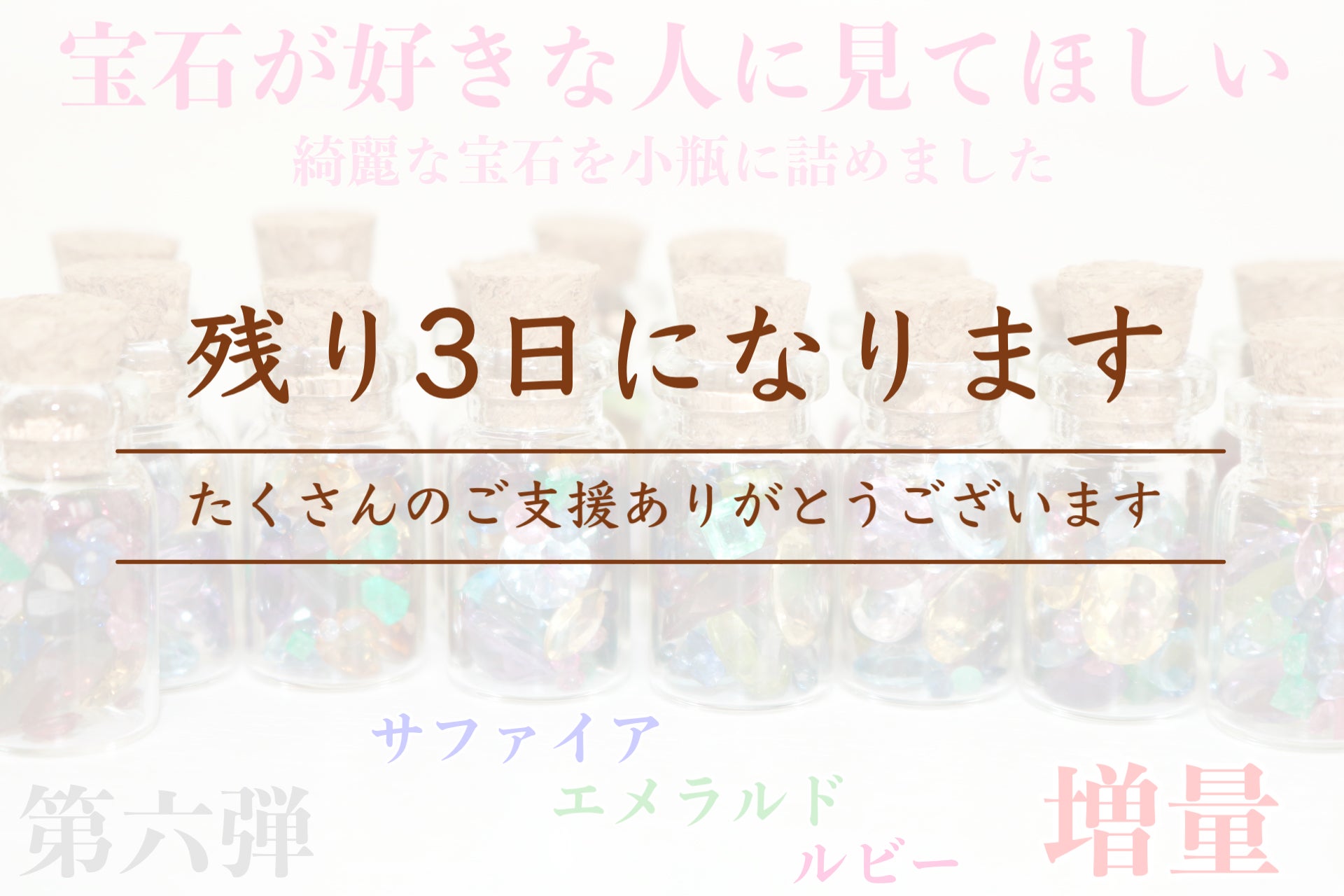 通常の宝石よりも小さいので種類、数、色が多く、キラキラの仕方も全然違うのでぜひ、通常の宝石瓶をご支援頂いた方は見比べて頂きたいです!
