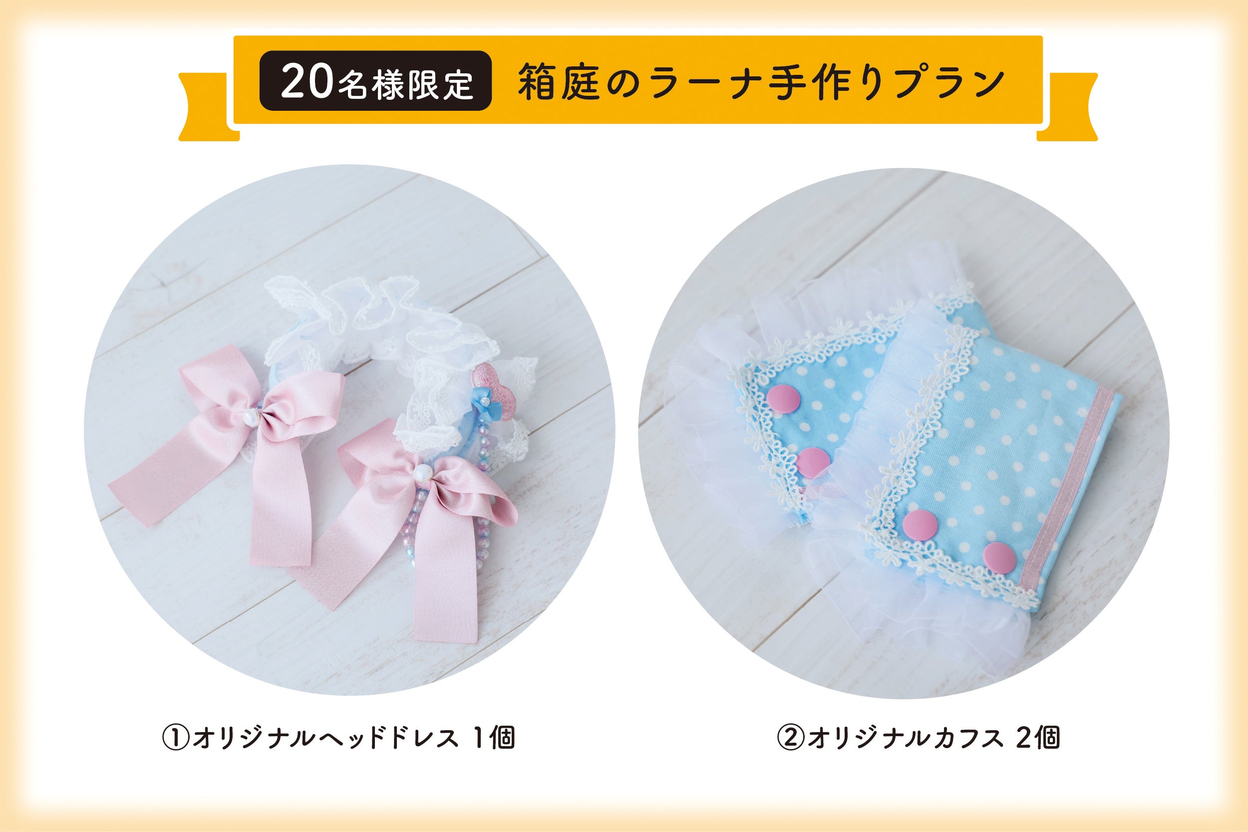 こちらもクラウドファンディングを記念して、「箱庭のラーナ」が手作りでヘッドドレスとカフスを制作致します!今回のプロジェクトのみ手に入れることができますのでお見逃しなく!