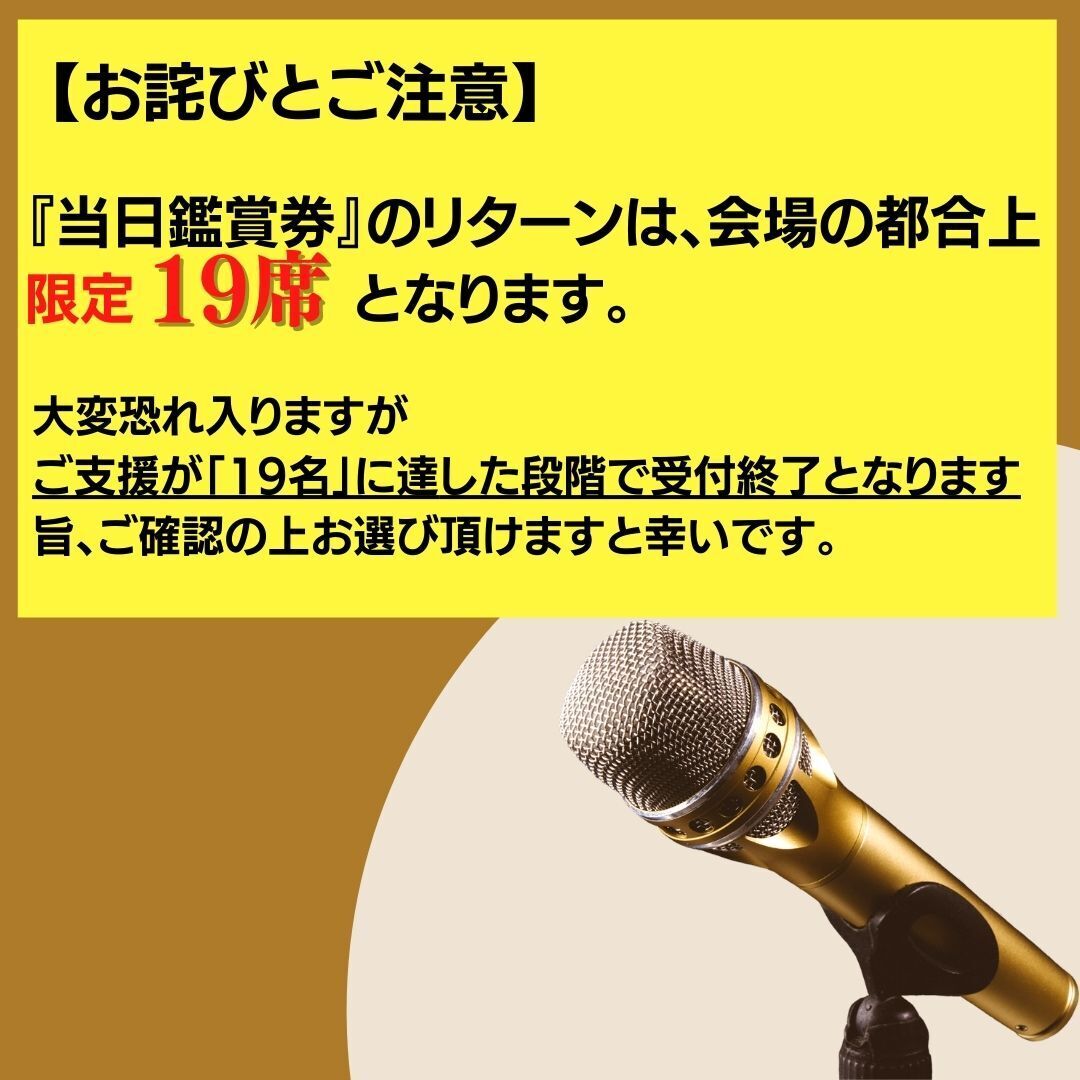 2022/02/01 10:43リターンを追加させていただきました!!このたび、『ライブ配信』を行うこととなりました。当日、ご都合が悪い方もアーカイブが残りますので、後日ご視聴いただくことが可能です。ご支援いただきました場合は、配信用限定URLをお送りします。※なお、すでに当日券のリターンをご購入の方で「配信があるならそちらの方が良い」という場合は、DMまたはクラファンのメッセージにて個人的にご相談ください。(ご返金は難しいのですが、他のリターンとの組み合わせにてご対応させて頂くことが可能です。) もっと見る