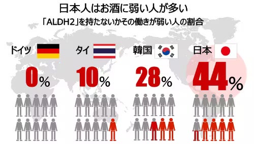 また、日本人のどれくらいの人がアルコールに弱い・飲めないといわれているかご存知でしょうか。驚くべきことに、約44%の方が体質的にアルコールに弱いといわれております。