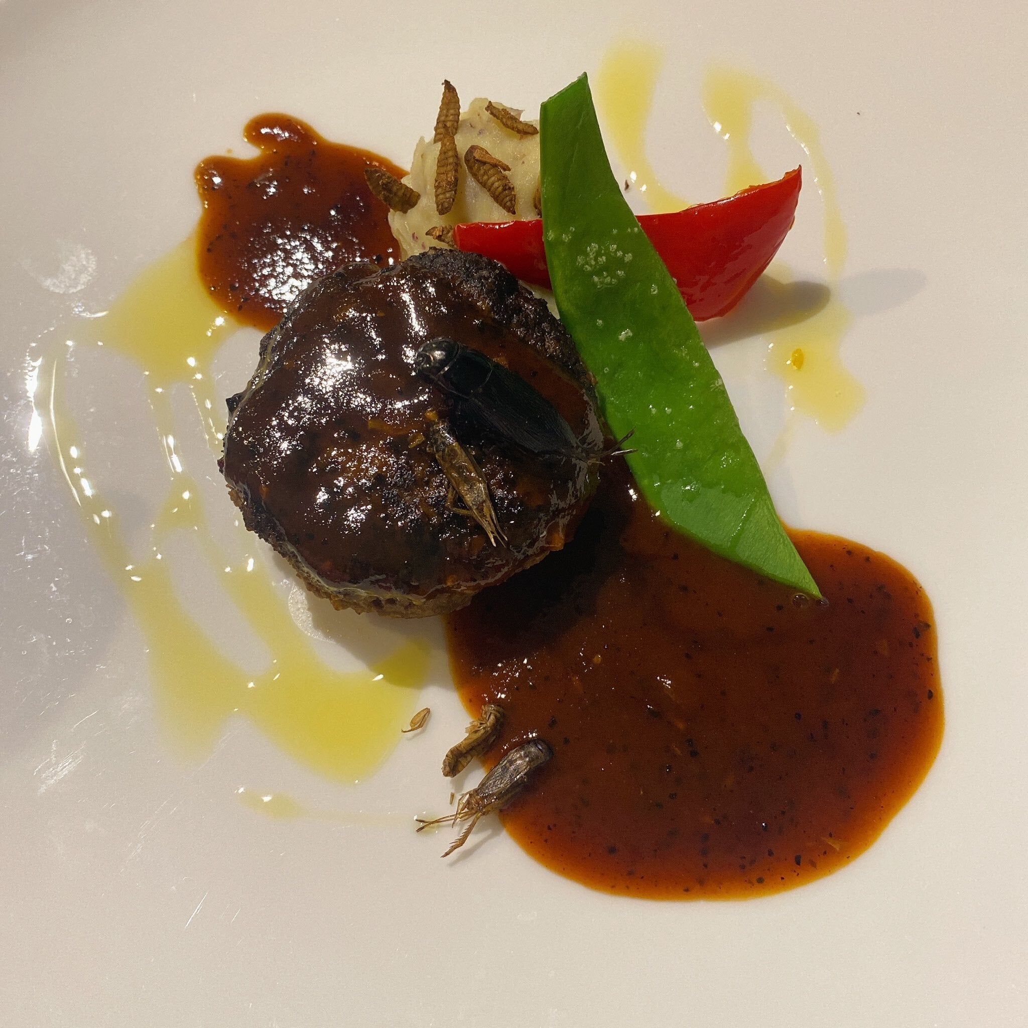 エゾ鹿とコオロギのハンバーグ 赤ワインとマゴットのソース