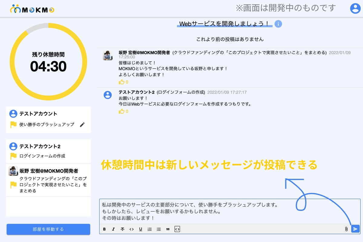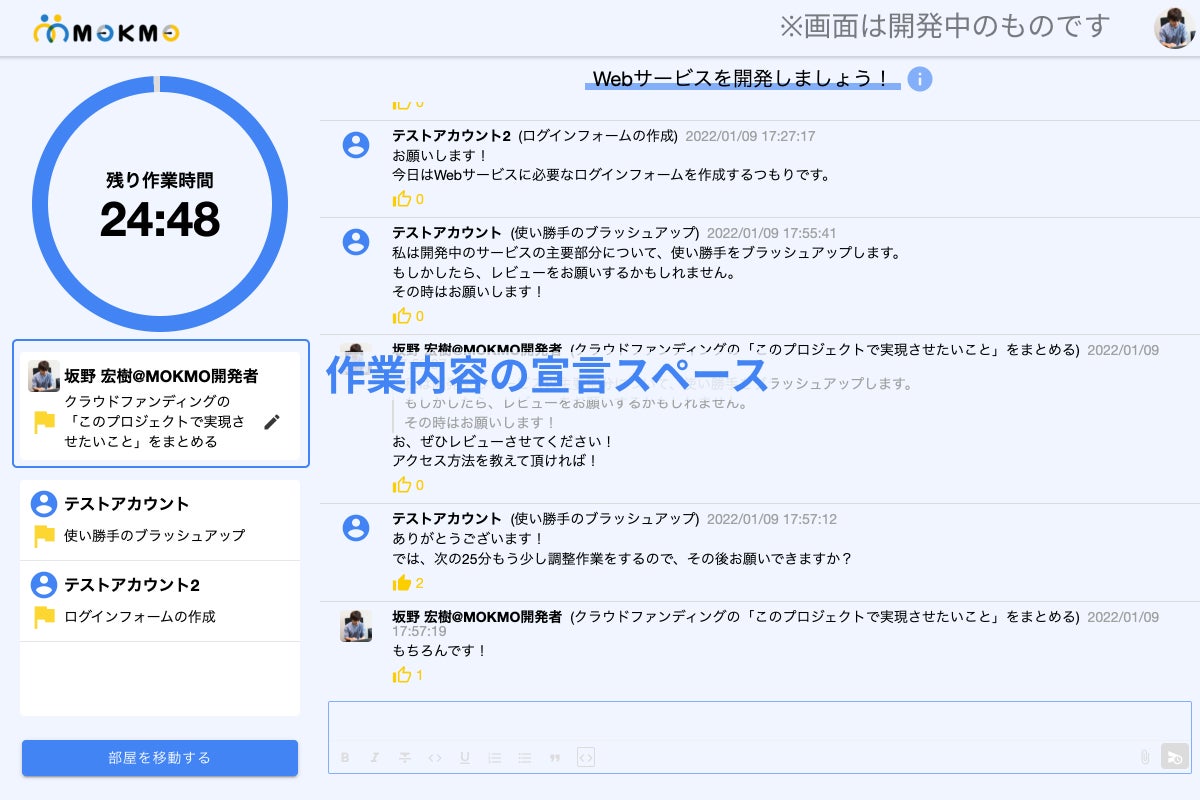 そこで、MOKMOでは、作業内容を仲間に宣言する専用スペースを設け、意識的に作業内容を明確化するためのきっかけを提示します。