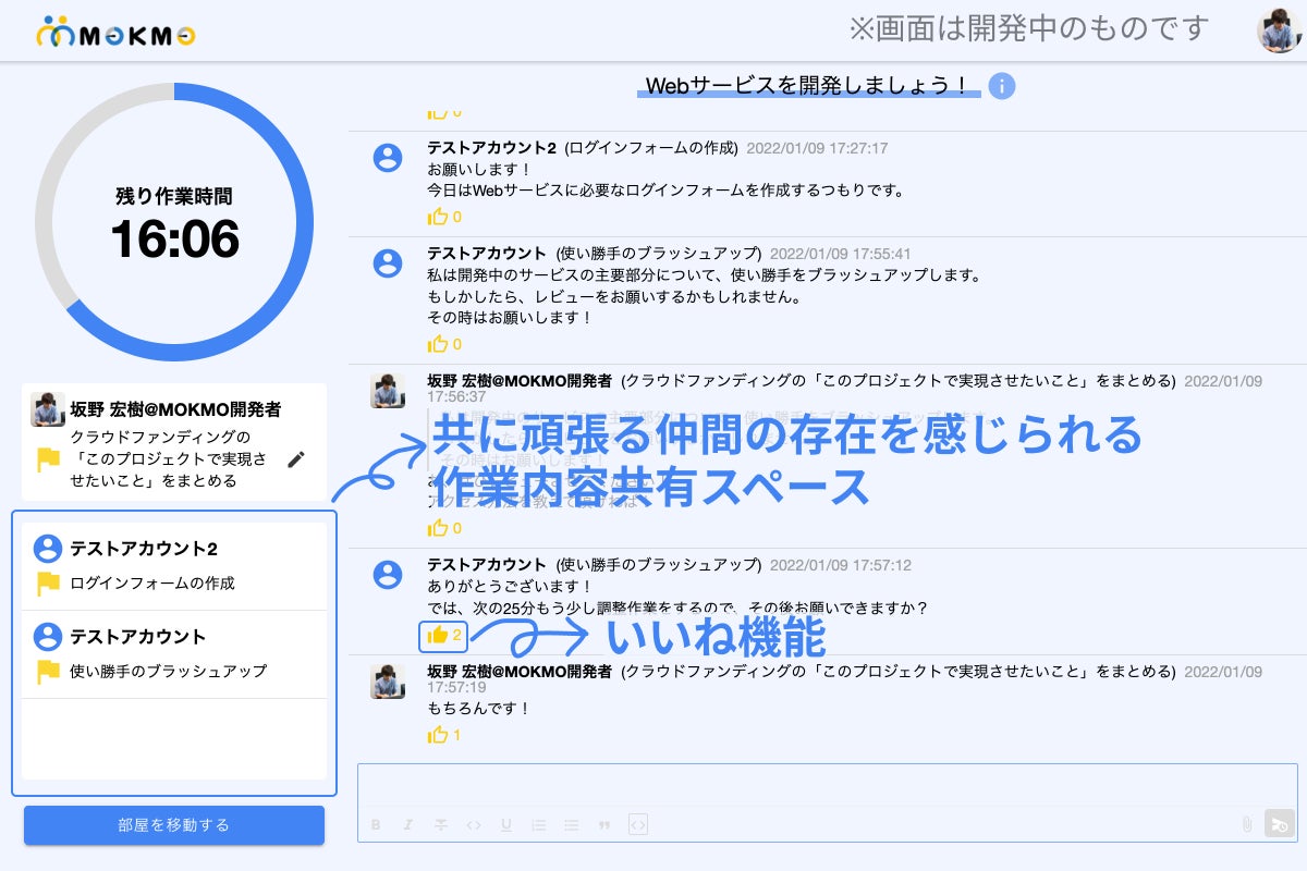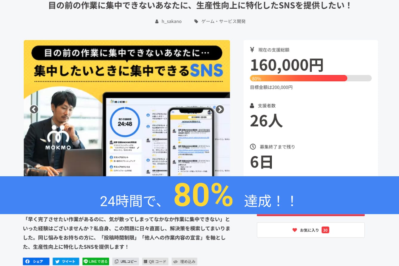 2022/03/21 23:34皆さまいつも応援いただき、誠にありがとうございます!プロジェクトオーナーの坂野です。26人もの方にご支援いただき、お陰様で目標の80%を達成いたしました!プロジェクト終了までついに残り1週間、全力で走り抜けます!プロジェクトページで説明しきれなかったMOKMOの機能については、活動報告の機能紹介タグにて紹介をしています。是非ご覧ください!また、「皆様の支援が必要な理由の詳細をご説明させていただきます」で説明させていただいた通り、MOKMOのサービスの運営にあたってが、あなたの支援が必要です...!少しでも使ってみたいと思われた方は、是非ご支援いただけますと幸いです。また、このプロジェクトについて、周りの方にご紹介いただけるとさらに嬉しいです。よろしくお願いいたしますm(__)m もっと見る