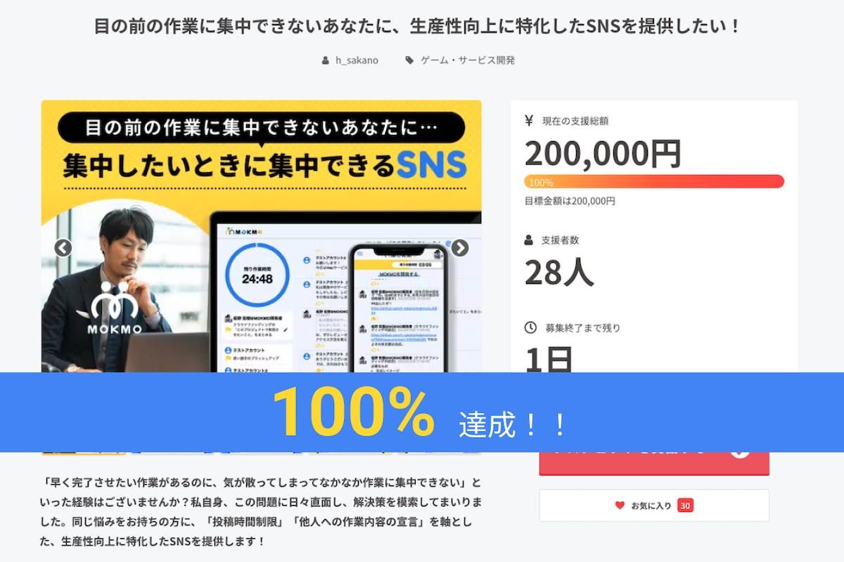 2022/03/26 13:46皆さまいつも応援いただき、誠にありがとうございます!プロジェクトオーナーの坂野です。28人もの方にご支援いただき、お陰様で目標の支援金額を達成しました!!!!ご支援いただいた皆さま、本当にありがとうございます!プロジェクトの残り期間は36時間程度となりましたが、ネクストゴールを25万円に設定いたします!25万円の支援金額を達成した場合は、MOKMOのスマホアプリ版の開発を進めさせていただきます!また、1,000円以上支援いただいた方には、プレミアムプランへの加入権をリターンとしてお届けいたしますので、是非支援をご検討ください!なお、プロジェクトページで説明しきれなかったMOKMOの機能については、活動報告の機能紹介タグにて紹介をしています。「皆様の支援が必要な理由の詳細をご説明させていただきます」で説明させていただいた通り、MOKMOのサービスの運営にあたってが、あなたの支援が必要です...!少しでも使ってみたいと思われた方は、是非ご支援いただけますと幸いです。また、このプロジェクトについて、周りの方にご紹介いただけるとさらに嬉しいです。改めまして、残り1日ちょっと、最後までよろしくお願い申し上げます! もっと見る