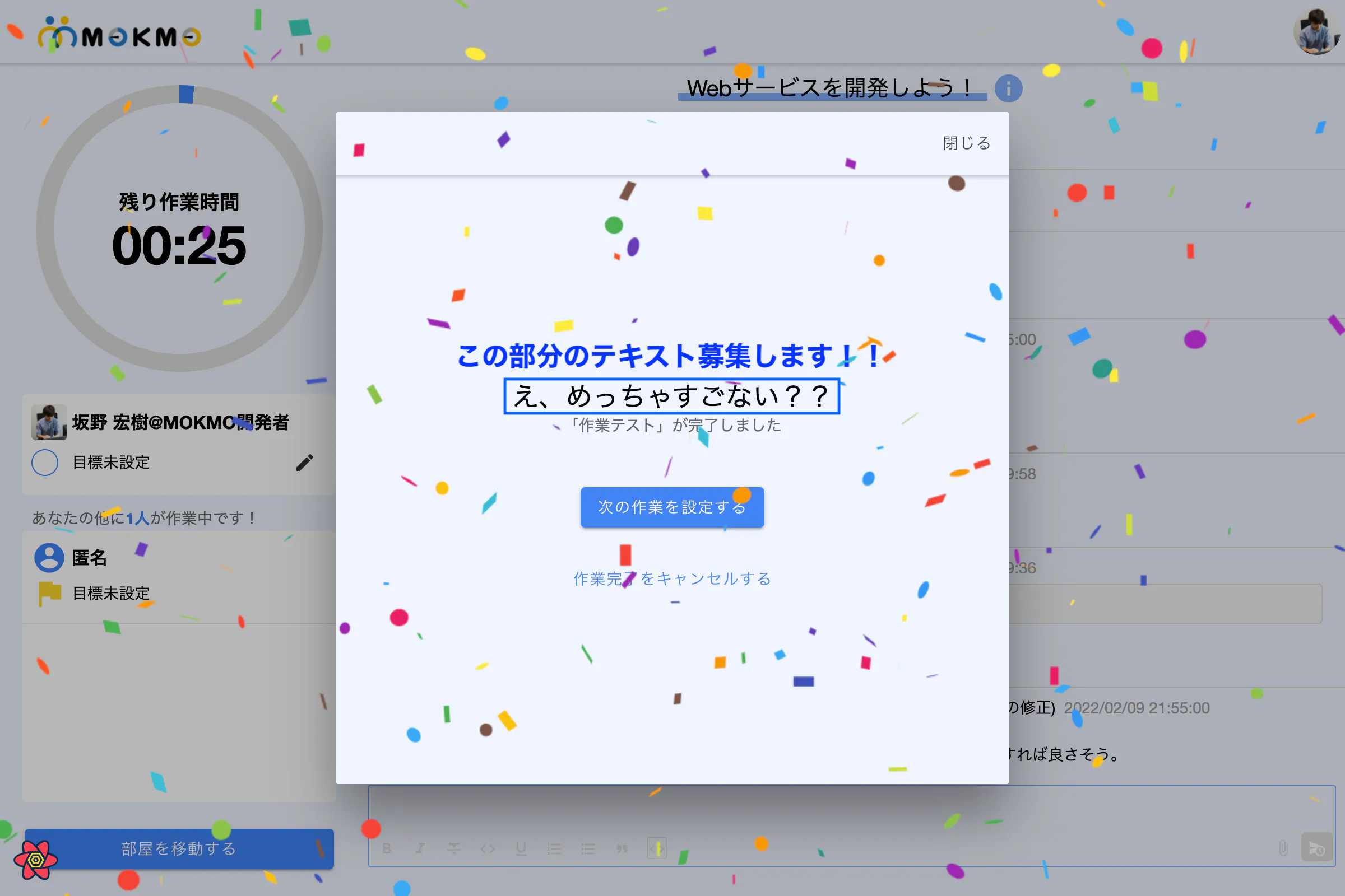 そうすることで、あなたの作業履歴に、完了した作業の内容が記録されるとともに、作業完了を祝う紙吹雪が表示されます!