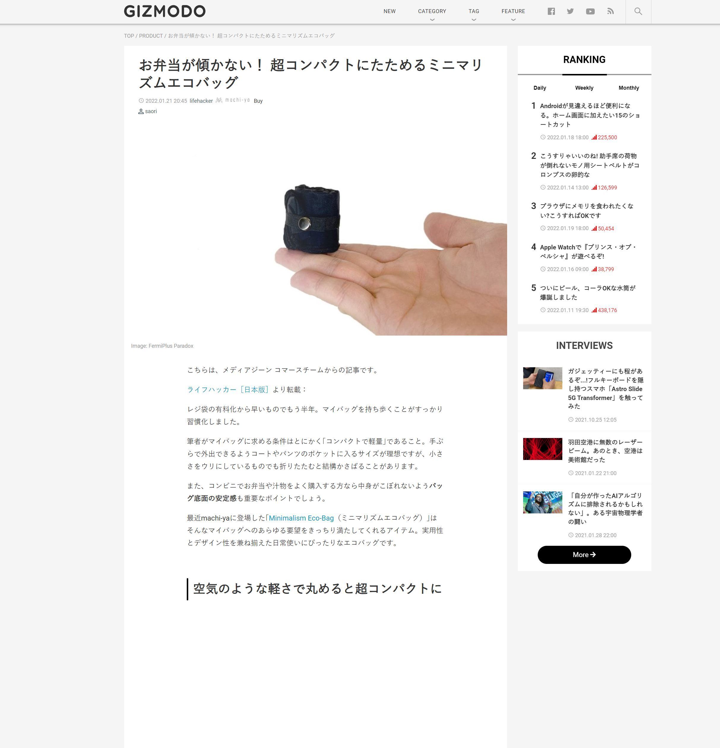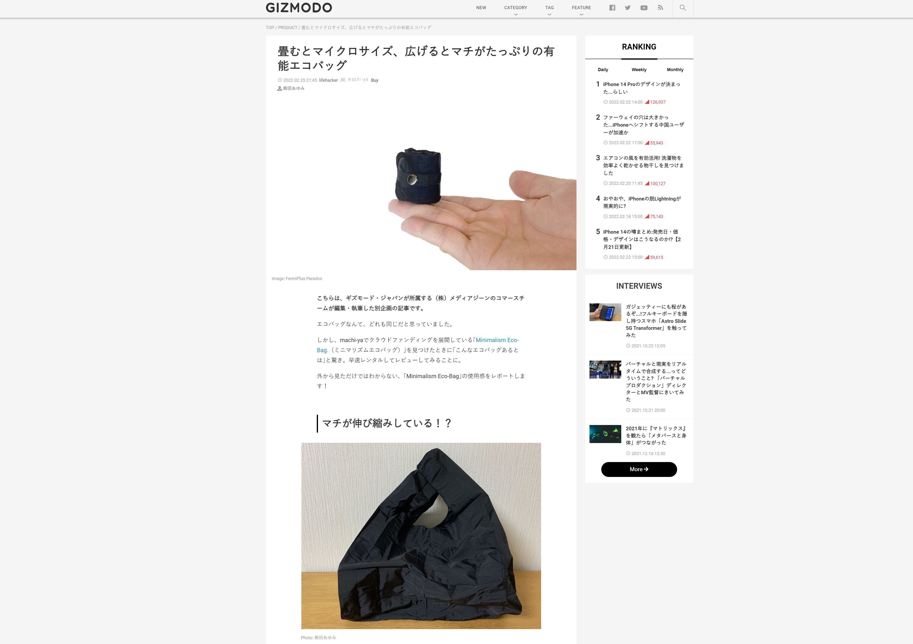 この度、ミニマリズムエコバッグの使用レビュー記事をGIZMODO様に取り上げて頂きました。是非ご覧いただけると嬉しいです。https://www.gizmodo.jp/2022/02/250888-machi-ya-minimalismecobag-review.htmlご支援も徐々に増えてきており、改めましてお礼申し上げます。引き続き、本プロジェクトをよろしくお願いいたします。