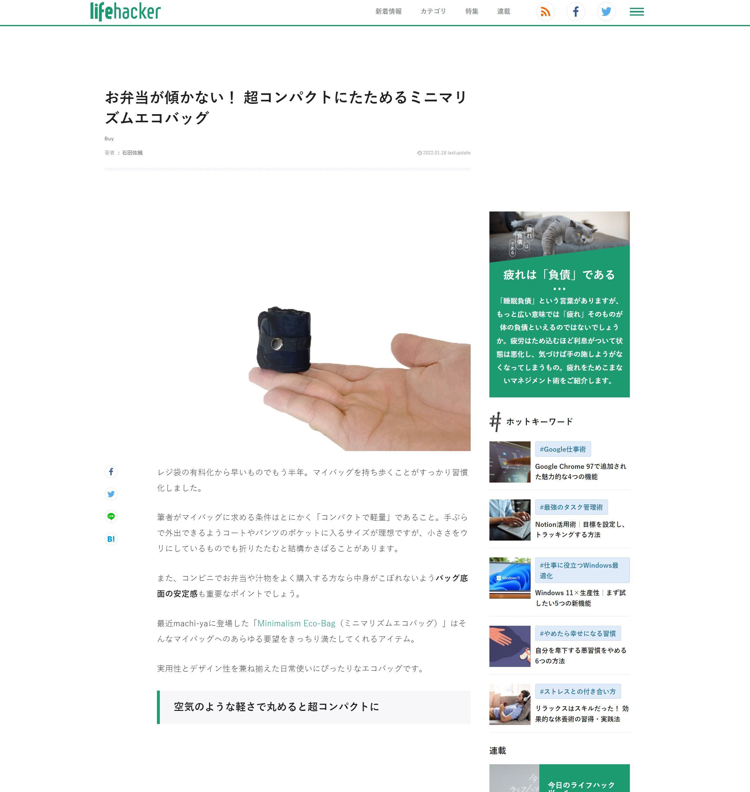 この度、当プロジェクトが Lifehacker[日本版]で取り上げられました。是非、下記URLより全文をご覧ください。https://www.lifehacker.jp/article/machi-ya-minimalismecobag-start/引き続き、買い物袋としてだけでなく、サブバッグや旅行の際のお供としても優秀な超小型エコバッグ"Minimalism Eco-Bag"をよろしくお願いいたします。