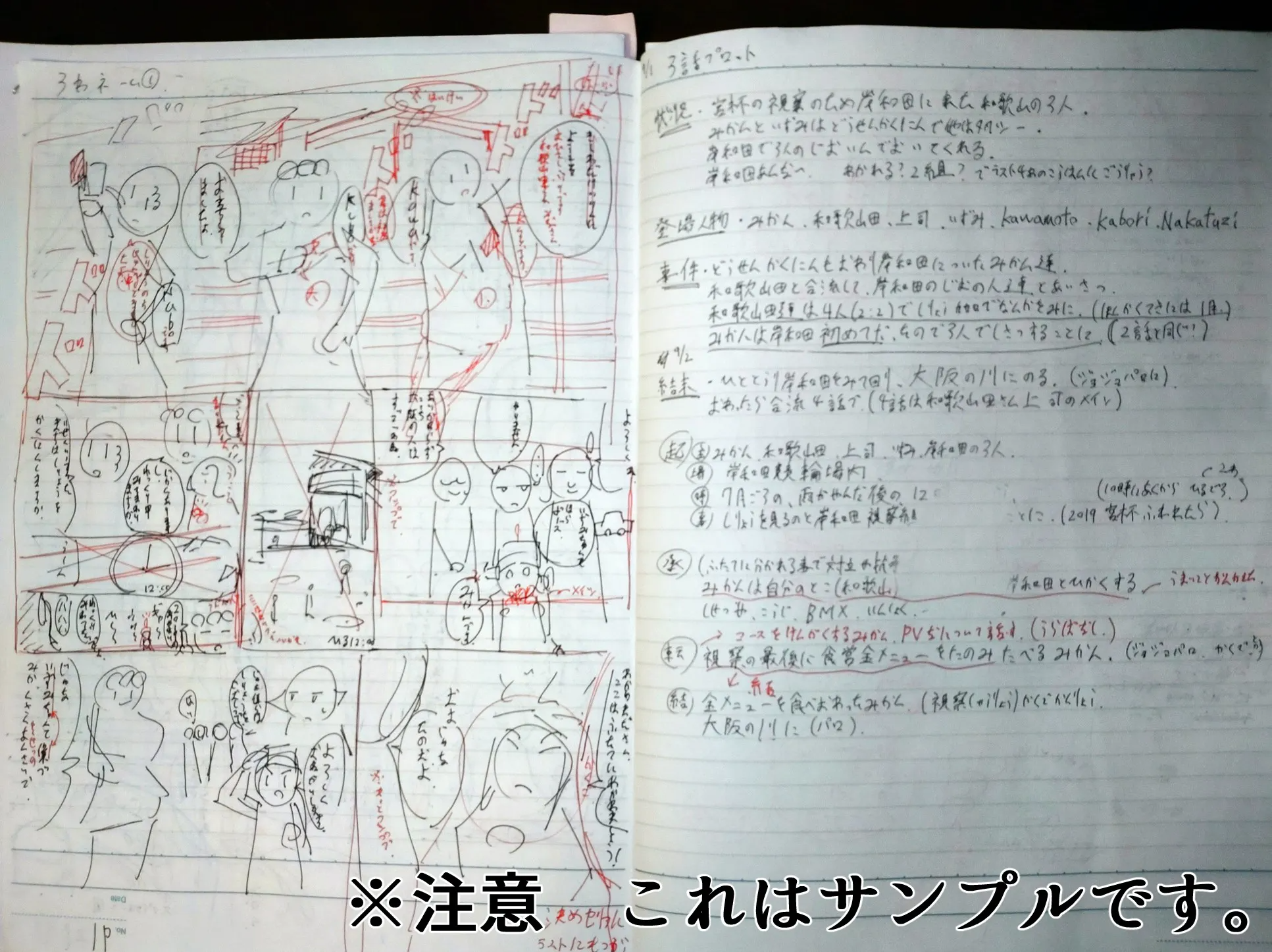 ご支援者に漫画の設計図である「ネームノート一冊」と「漫画のキャラクターが、ご支援者に向けたお礼のコメント付きイラスト」をネームノートの表紙に描いて、をお送りいたします。