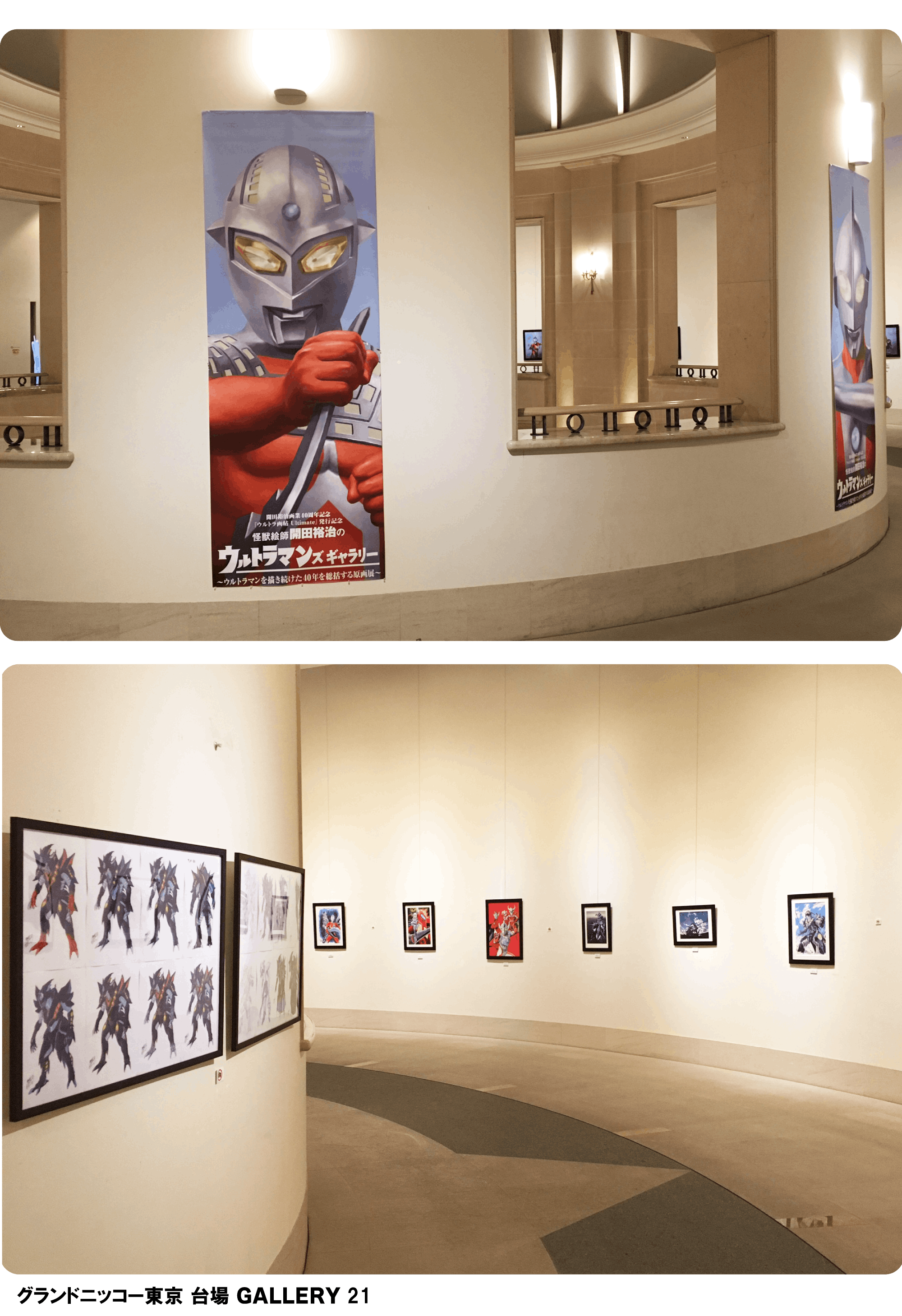 回廊を埋め尽くす開田裕治の「ウルトラQ・ウルトラマンの原画世界」、「ウルトラマンの自画像ファイナル企画」や西川伸司が描く「GRIDMAN&DYNAZENON」の迫力の展示は必見!