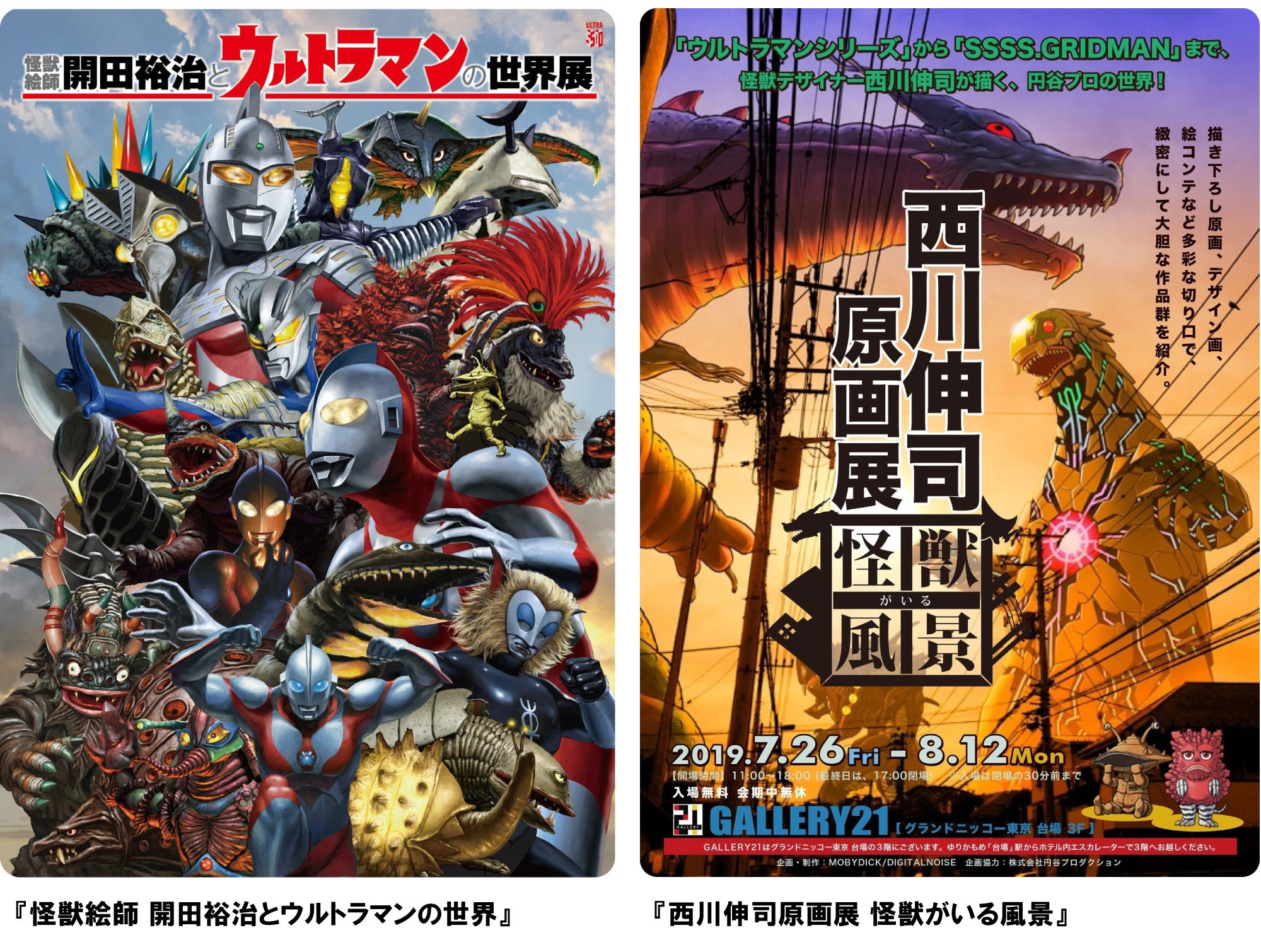 『開田裕治 西川伸司 地上最大の怪獣絵師祭り ウルトラQからSSSS.DYNAZENON』は、40年以上にわたり怪獣プラモデル黎明期からLDなどの映像ソフトなどパッケージアートを描き続けるイラストレーターのパイオニア「開田裕治」、漫画家生活33周年を迎える人気漫画家とTVアニメ「SSSS.GRIDMAN」「SSSS.DYNAZENON」などの怪獣デザインを手掛ける怪獣画界の第一人者という多彩な顔をもつ「西川伸司」による円谷プロ作品初の「怪獣絵師原画展」です。