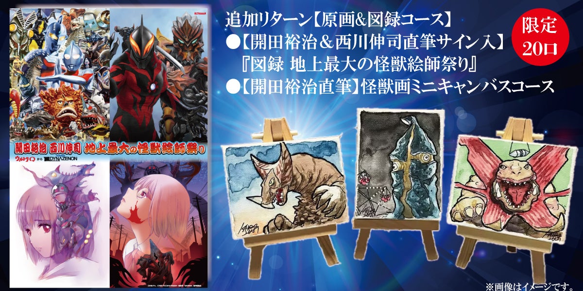 <限定20口>【開田裕治&西川伸司直筆サイン入】BOOSTER限定版 『「開田裕治 西川伸司 地上最大の怪獣絵師祭り ウルトラQからSSSS.DYNAZENON」図録』+【開田裕治直筆】怪獣画ミニキャンバス(ミニイーゼル付き)