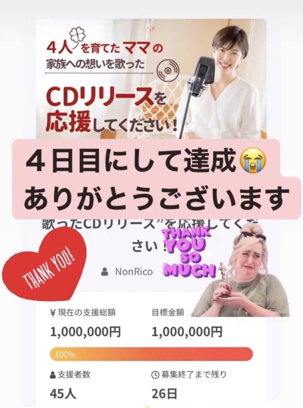 皆様のおかげで、開始4日目にして目標金額達成することができました!