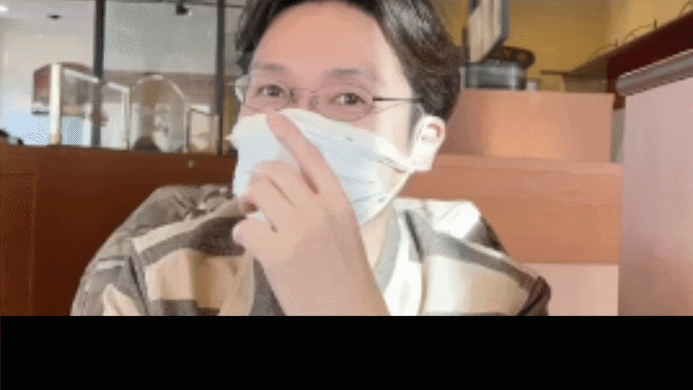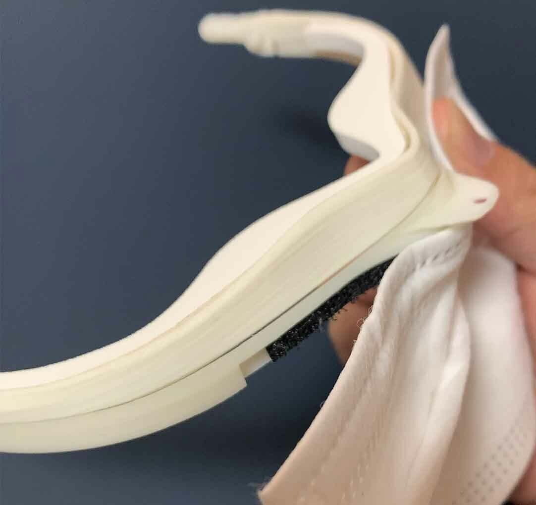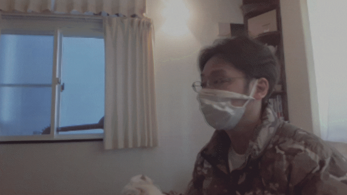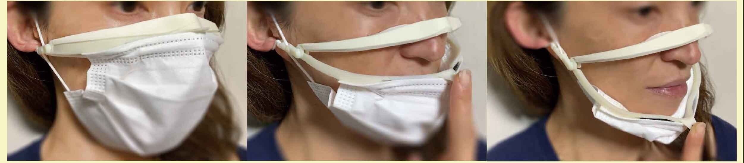 このフレームを付けたマスクは、不織布マスクの機能を失うことなく、密閉度を高め、なおかつ開閉を半自動化し、食事を口に運ぶ時以外は密閉が保たれる構造になっています。