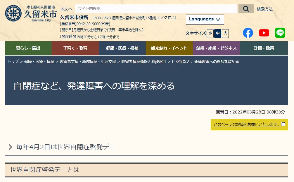 久留米市のホームページ内でもWarm Blue KURUME 2022について掲載されましたーっ!!今回も共催として、障害福祉課をはじめ久留米市にはたくさんのご協力をいただいています。そんな中で今回はホームページでも「世界自閉症啓発デーについて」「久留米市での取り組み」「アンケートへのご協力のお願い」「発達障害の理解のために」という内容で掲載頂いています。少しでも多くの方の目に触れ、理解の輪が広まることを期待しています。是非、一度ご確認と拡散をお願い致します。また、アンケートへのご協力もよろしくお願い致します。久留米市HP