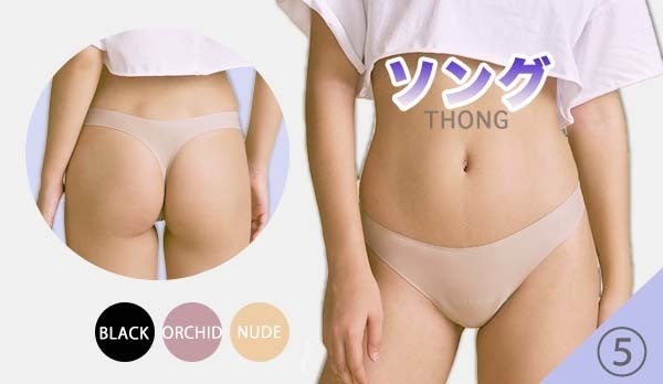 ③ハイライズ、④ミッドライズ、⑤ソングの3種類はシームレスだから、縫い目がないことがポイントです。