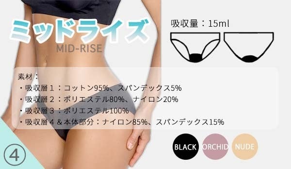 ミッドライズは通常のショーツに近い形で履くことができるので、ナプキンから吸水ショーツへの乗り換えが違和感なく行えます。また吸水ショーツだけに頼るのは不安という方も、吸水ショーツにナプキンをつけることが可能なので、サリタニーショーツよりもっと確実に漏れがないようにしたい方は、ミッドライズにナプキンをつける方法もおすすめです。(ナプキン2~3枚分の吸水量)