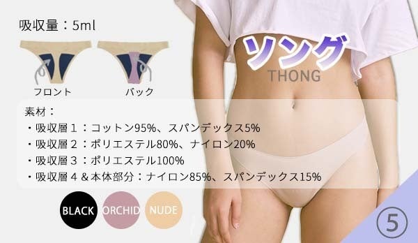 ソングは布面積が狭いので吸収量もそれに応じて少なくなりますが、普段ヒモ状の下着を履かれている方が生理中もおしゃれにこだわって履けるように開発しました。生理期後半の経血が少なくなったタイミングでソングに履き替えたり、オリモノが少し気になる時期などには最適です。(ナプキン約1枚分の吸水量)