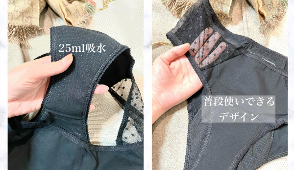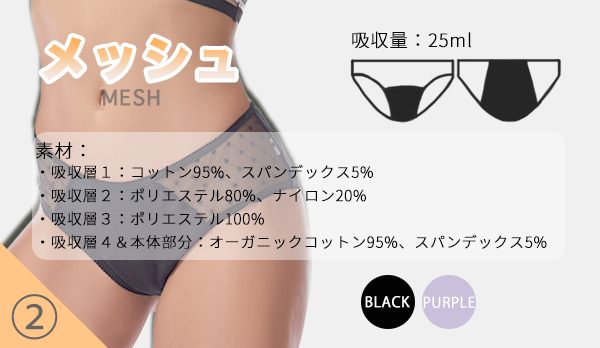 「生理中だけど下着のおしゃれも欠かしたくない!」という方におすすめの商品。メッシュだけどその吸水量は25mlとなっており、シリーズの中でも高い吸収力を誇るところがポイントです。(ナプキン4~5枚分の吸水量)