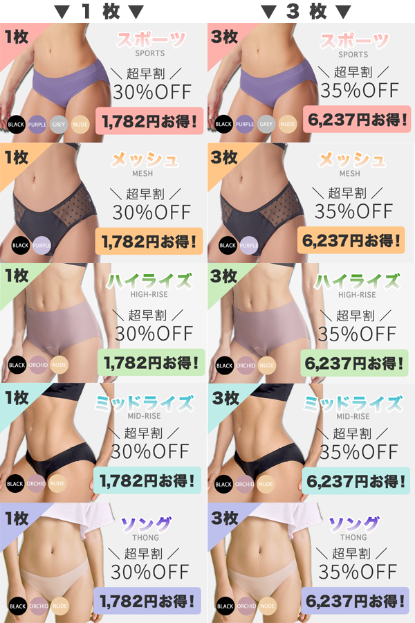 スタイルは、①スポーツ、②メッシュ、③ハイライズ、④ミッドライズ、⑤ソングの全5種類!