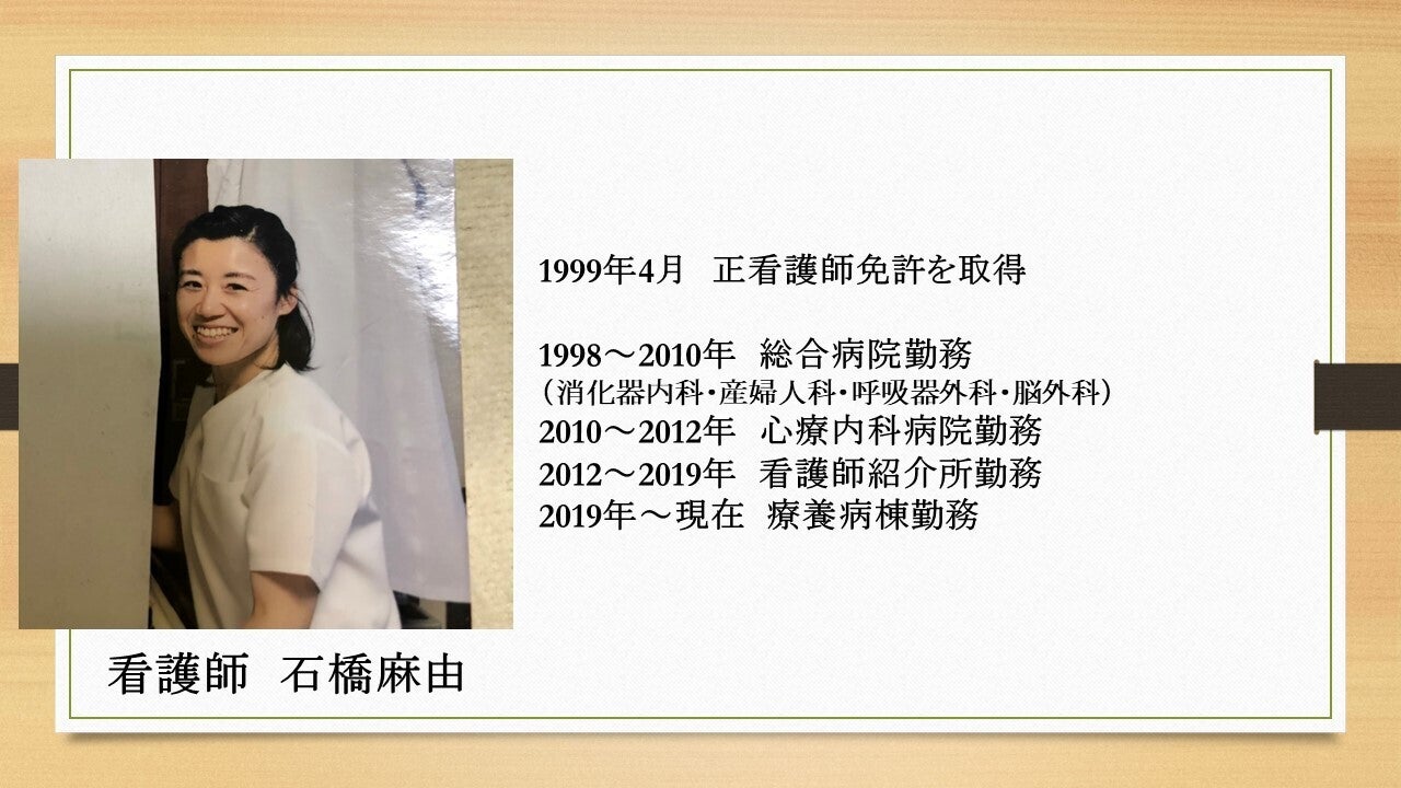 24年間、たくさんの患者さんやご家族と関わってきました。病気の発覚から看取りまで幅広く経験してきました。食事や運動など生活習慣のアドバイスも行ってきました。