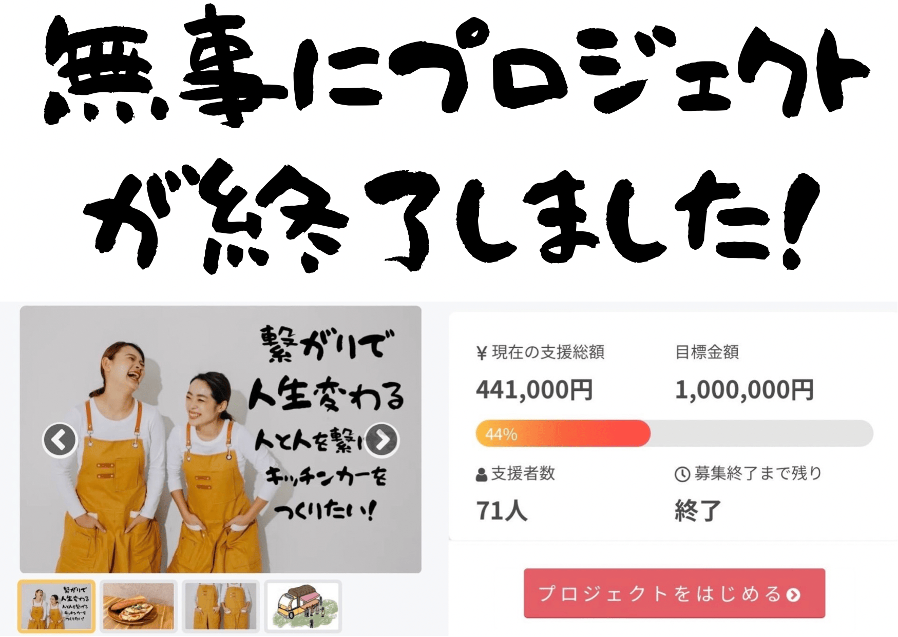 2022/03/01 15:01『繋がりで人生は変わる!人と人を繋げるキッチンカーを作りたい!in愛知』のプロジェクトをさせていただいている尾曽小夏と山﨑星菜です。皆様のご支援、ご協力のおかげでプロジェクトが無事に終了いたしましたこと、本当に感謝申し上げます。現在支援総額:441,000円支援者数71名※詳細はこちらからご覧いただけますhttps://camp-fire.jp/projects/view/541293リターンについては順番にお送りいたしますのでよろしくお願いします。クラウドファンディングを通して本当に沢山の方々からメッセージを頂きました。1人1人から頂いたメッセージを読ませていただき温かい言葉に元気や勇気を沢山いただきました。本当に感謝の気持ちでいっぱいです。最初はキッチンカーを始めたいと思っていても何も行動にすることもできず、何も分からないだけの私たちでした。クラウドファンディングを通してやりたいと〝思う〟だけじゃなく行動に移すことの大切さを身にしみて実感しました。私たちにとってはここからが始まりです!今後の活動内容もインスタ等で報告していきますので、温かく見守っていただきけると嬉しいです。 ※Instagramはこちらからご覧いただけますhttps://www.instagram.com/cheinatsu/?hl=bg改めてご支援いただきまして誠にありがとうございます。引き続き応援よろしくお願いします。 もっと見る