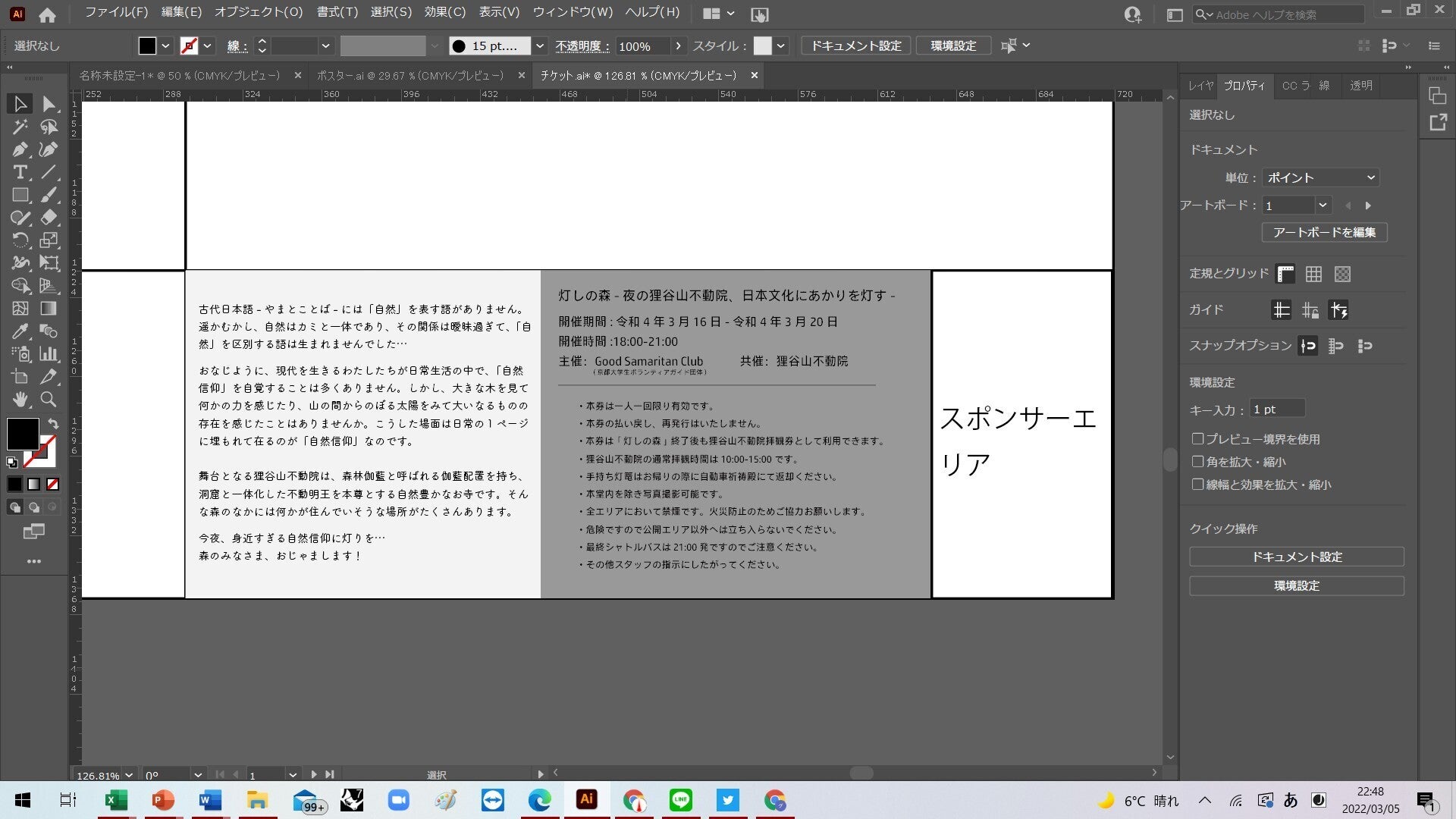2022/03/10 09:36こんにちは!京大二回 宮田です!企画はいよいよ佳境、クラファンはいよいよ最終日になりました。多くのご支援ありがとうございます。現状クラウドファンディングであと【10万円】を目標としています!僕ら自身も身を切る覚悟で臨んでいますが、このままだと本当に厳しいです。ご支援をよろしくお願いします。さて、チケットが出来上がりました!写真は裏面です。表面は、、、来てからのお楽しみ♪チケットは来場される方には当日引き渡し、来場されなかった方には返礼品と共に郵送する予定でいます。チケットはたくさん用意しているので、チケットがなくなるくらい多くの方に来場していただけたら嬉しいです!P.S.昨日は東山花灯路にてチラシを配布して参りました。東山花灯路期間中はねねの道でチラシ配布予定で、総合案内所にも灯しの森のチラシが置いてあるので、ぜひ訪れる際は手にとっていただけたらと思います。 もっと見る