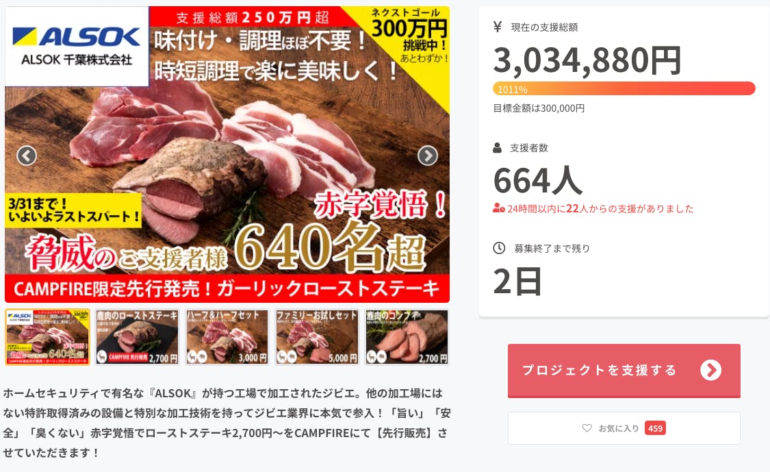 2022/03/29 12:00募集終了は3月31日23:59:59です!駆け込みご支援お待ちしております!終了日目前にしてネクストゴールとしていた300万円を達成することができました!ご支援者の皆様、誠に!誠にありがとうございます!!!!!残り2日となっております!募集終了は31日23:59:59です。この価格で挑戦できるのはこれが最初で最後のチャンス・・!本気ジビエ、試してみませんか。駆け込みご支援お待ちしております!私たちも最後の2日間、全力で頑張らせていただきます!よろしくお願いします! もっと見る
