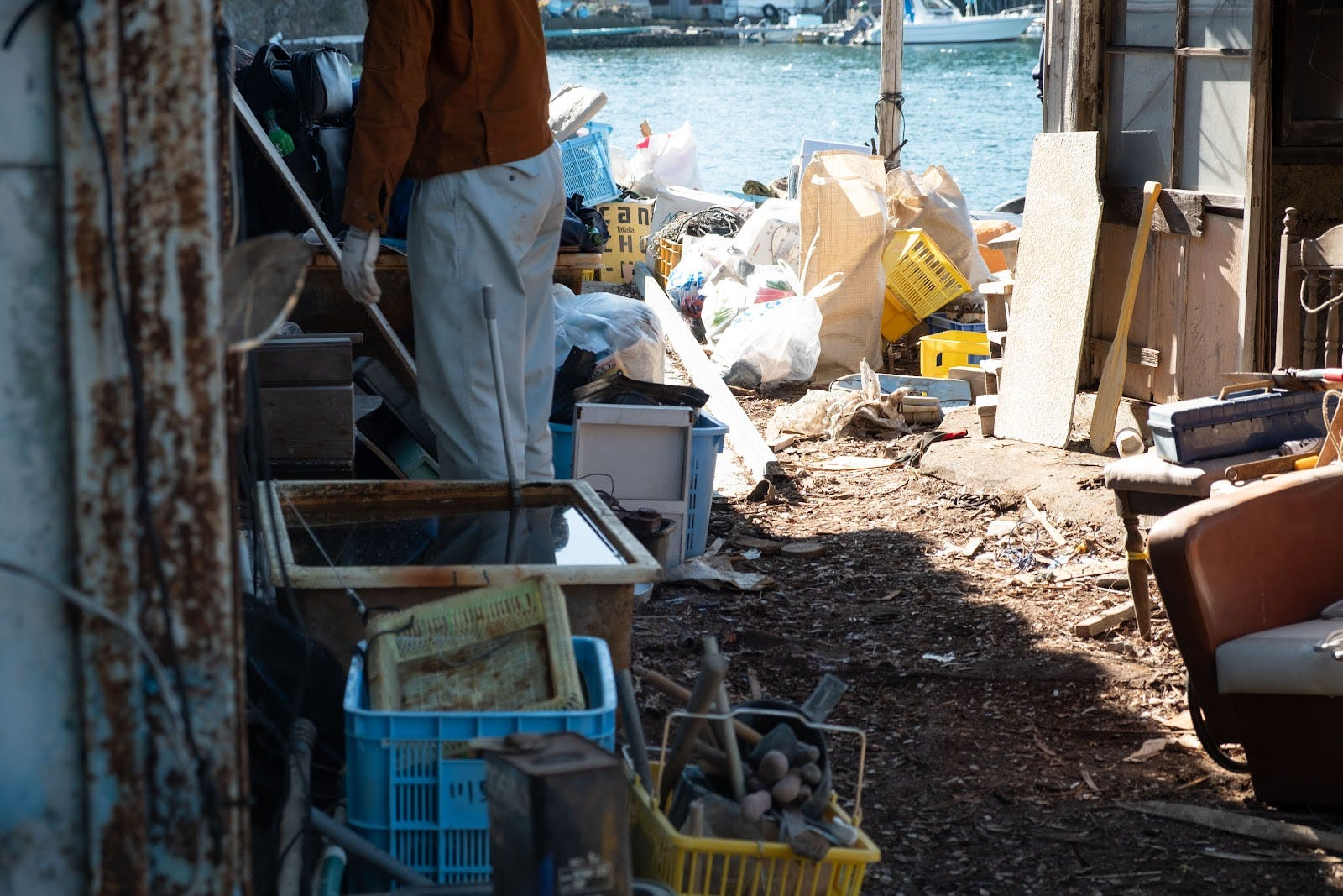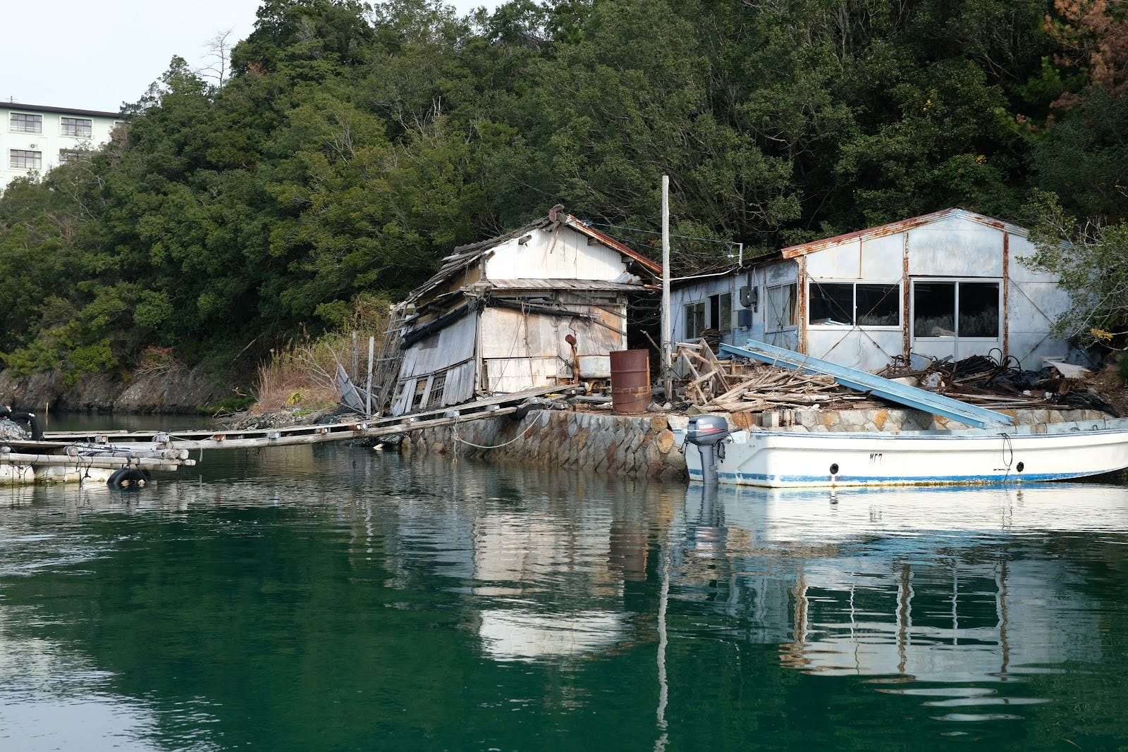 岸壁が崩れ、生い茂った草木、真珠養殖に使用していた海洋プラスチック類や瓦礫で足の踏み場も無くなった場所に、老朽化した工場がポツンと取り残されています。