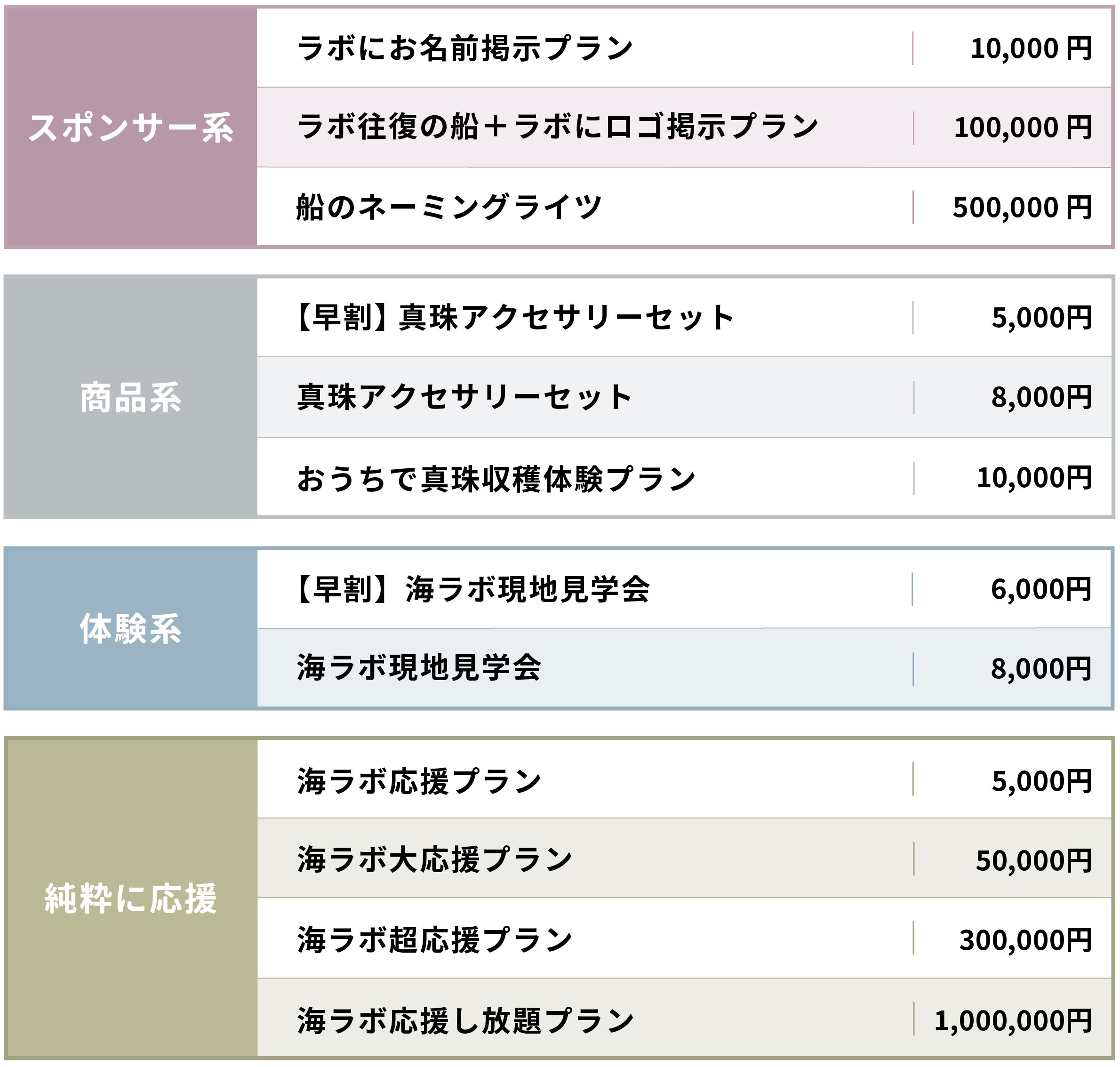 リターンには真珠アクセサリーなどの商品や、海ラボの見学会、スポンサーの権利などをご用意しています!