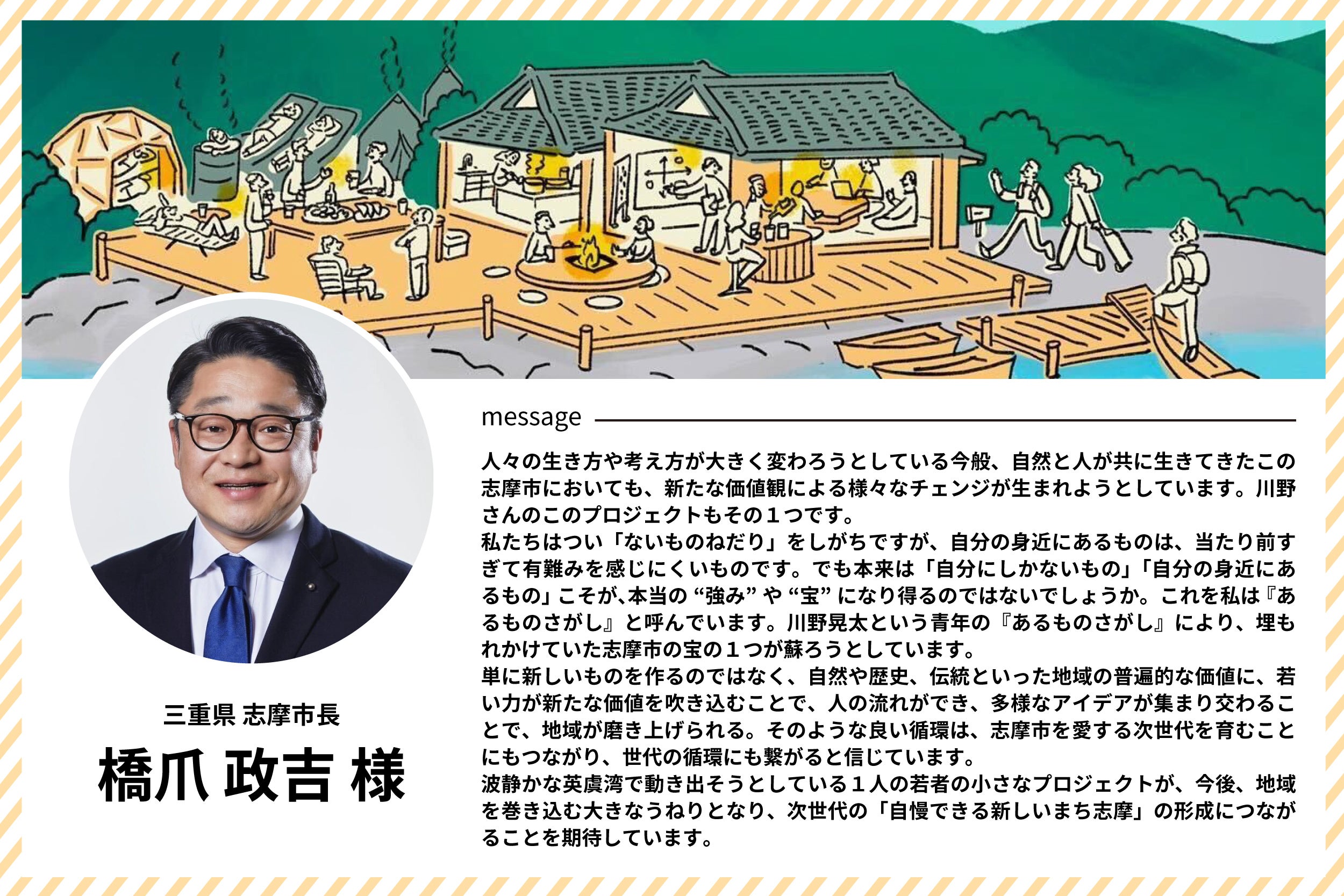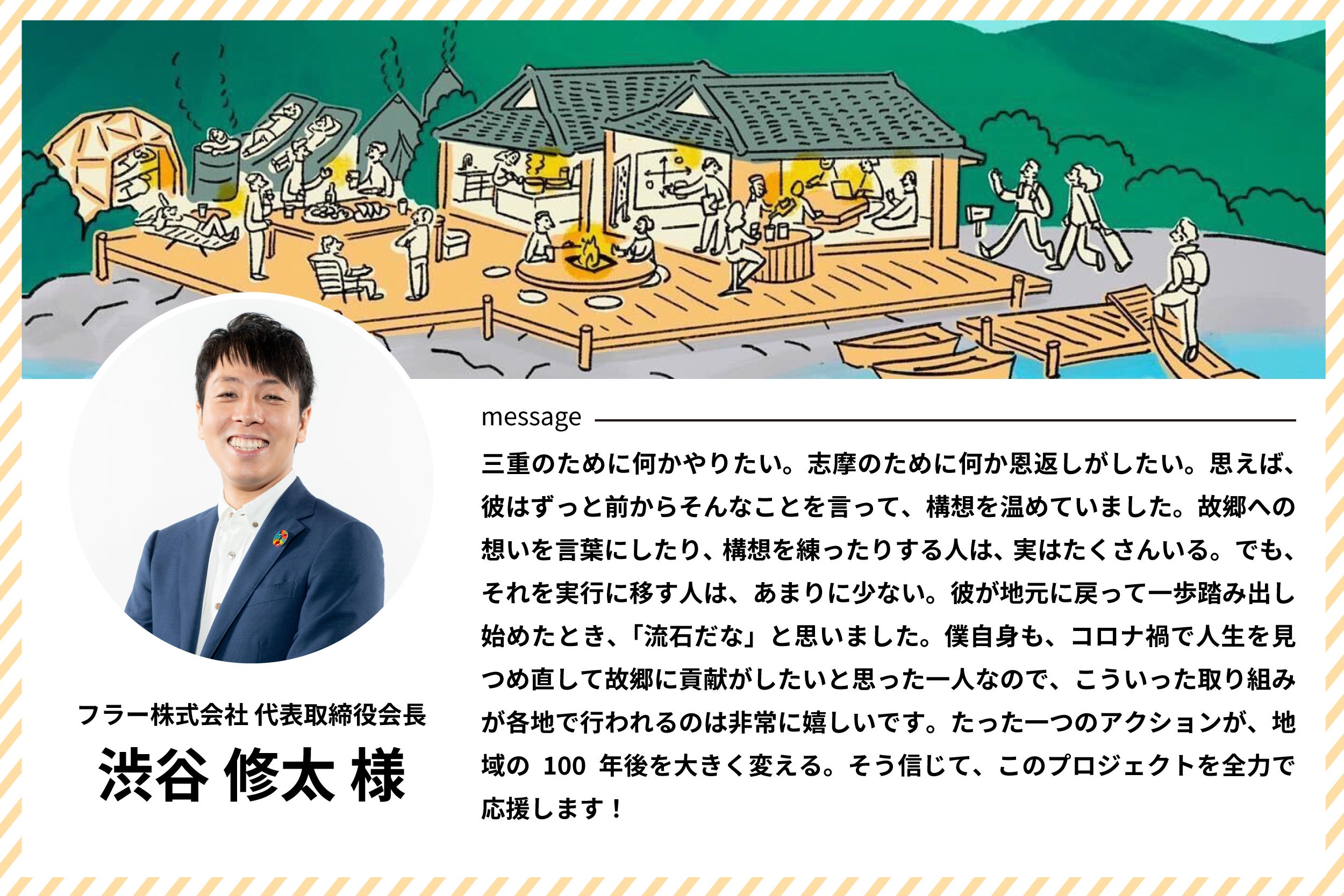 三重県志摩市長の 橋爪 政吉 様・フラー株式会社 代表取締役会長の 渋谷 修太 様から応援メッセージをいただきました!