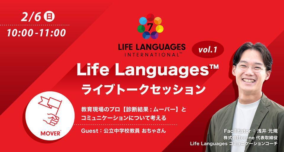 明日2/6(日)10時から、『Life Langauges™ライブトークセッションvol.1:Mover言語のコミュニケーション特性』を開催!https://fb.me/e/5GblW02B9このライブトークセッションでは、Life Languages™を受けたゲストをお招きし、その方の持つコミュニケーション言語を紹介しつつ、共に7つの言語を理解していきたいと思います。今回のゲストは、公立中学校教員をされている「おちゃさん」です!彼女の第一言語は「Mover:ムーバー」ですが、その特性が日頃のコミュニケーションにどう影響を与えているか。また、教育者の視点からコミュニケーションについてどう感じるかなどを語り合っていきたいと思います!FBライブで配信されるライブトークセッションは、ラジオ感覚で聴くことができますので、ゆるりとお立ち寄りいただければと思います!イベントページからぜひご参加ください!https://fb.me/e/5GblW02B9