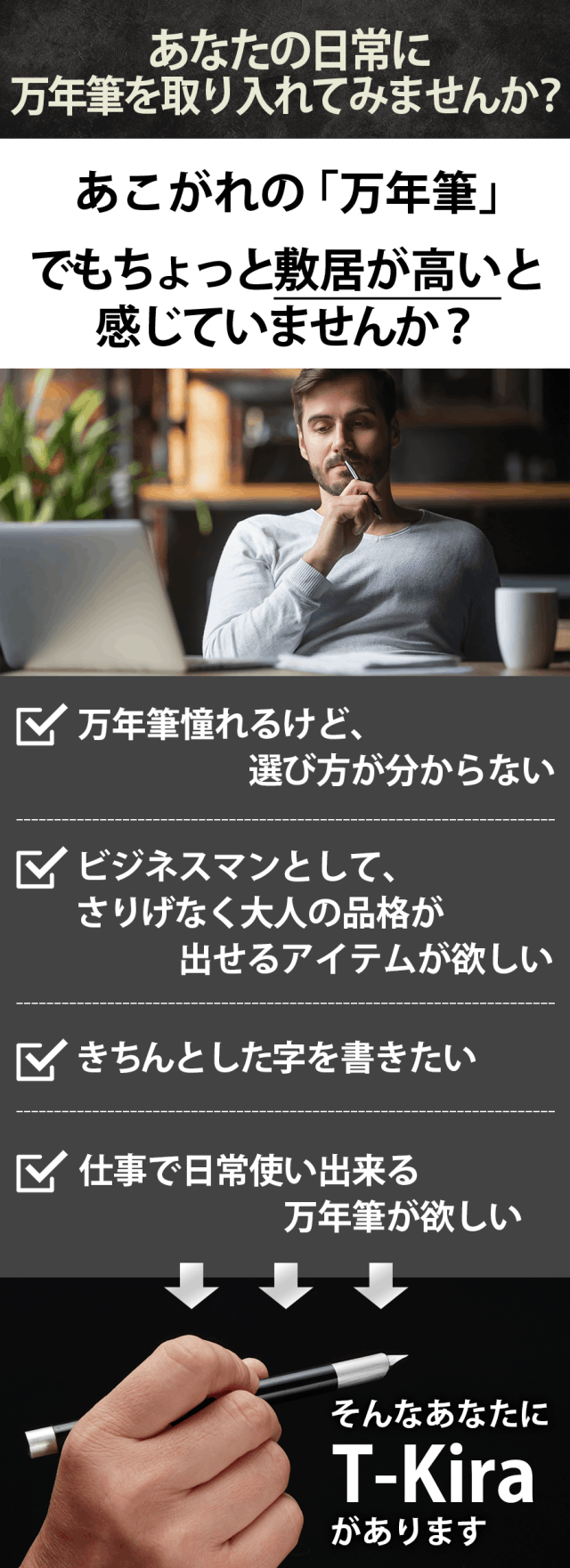敷居が高いと思われがちな万年筆を、高いデザイン性をそのままに普段遣いの筆記用具に変えてくれるのがT-Kiraです。