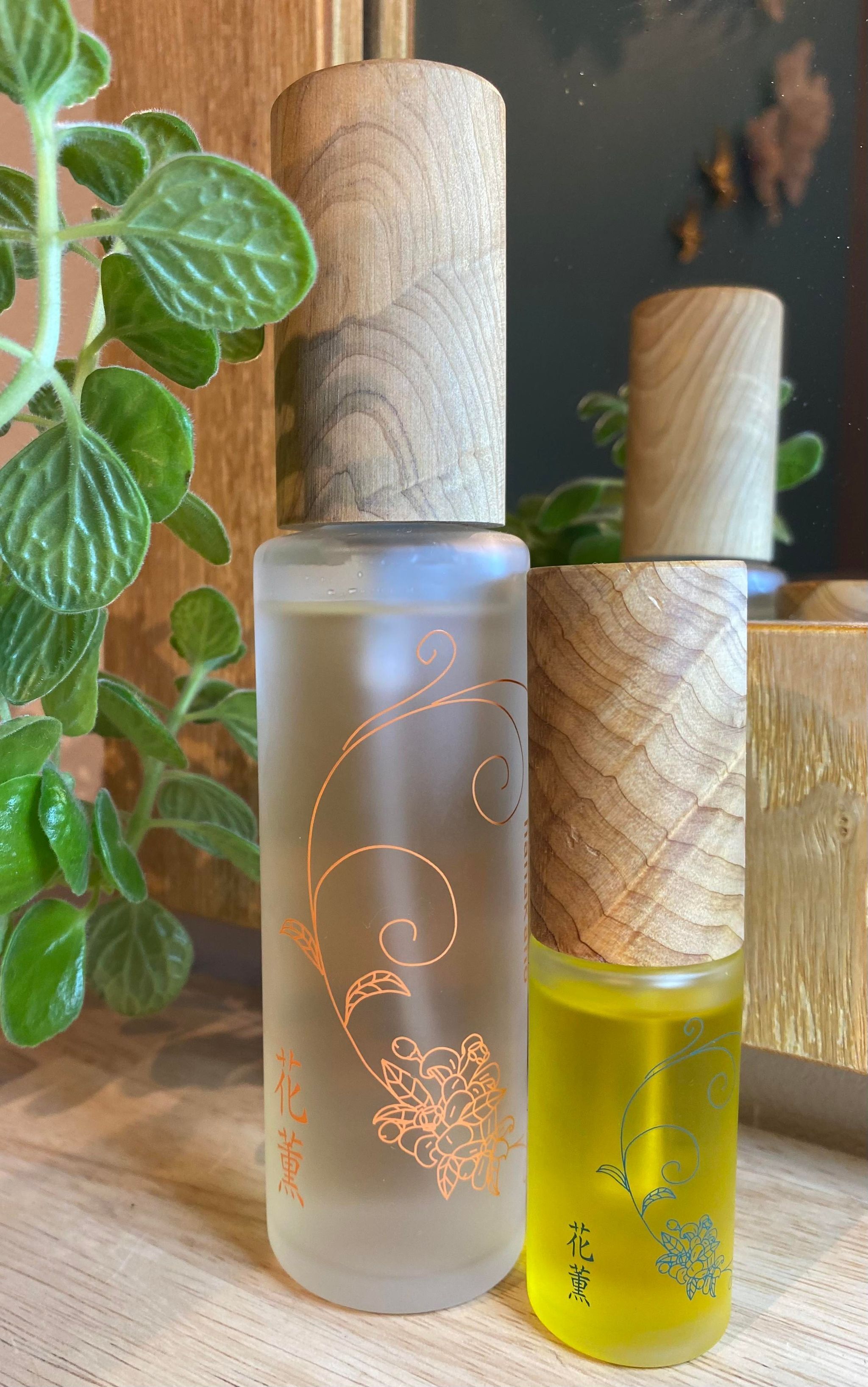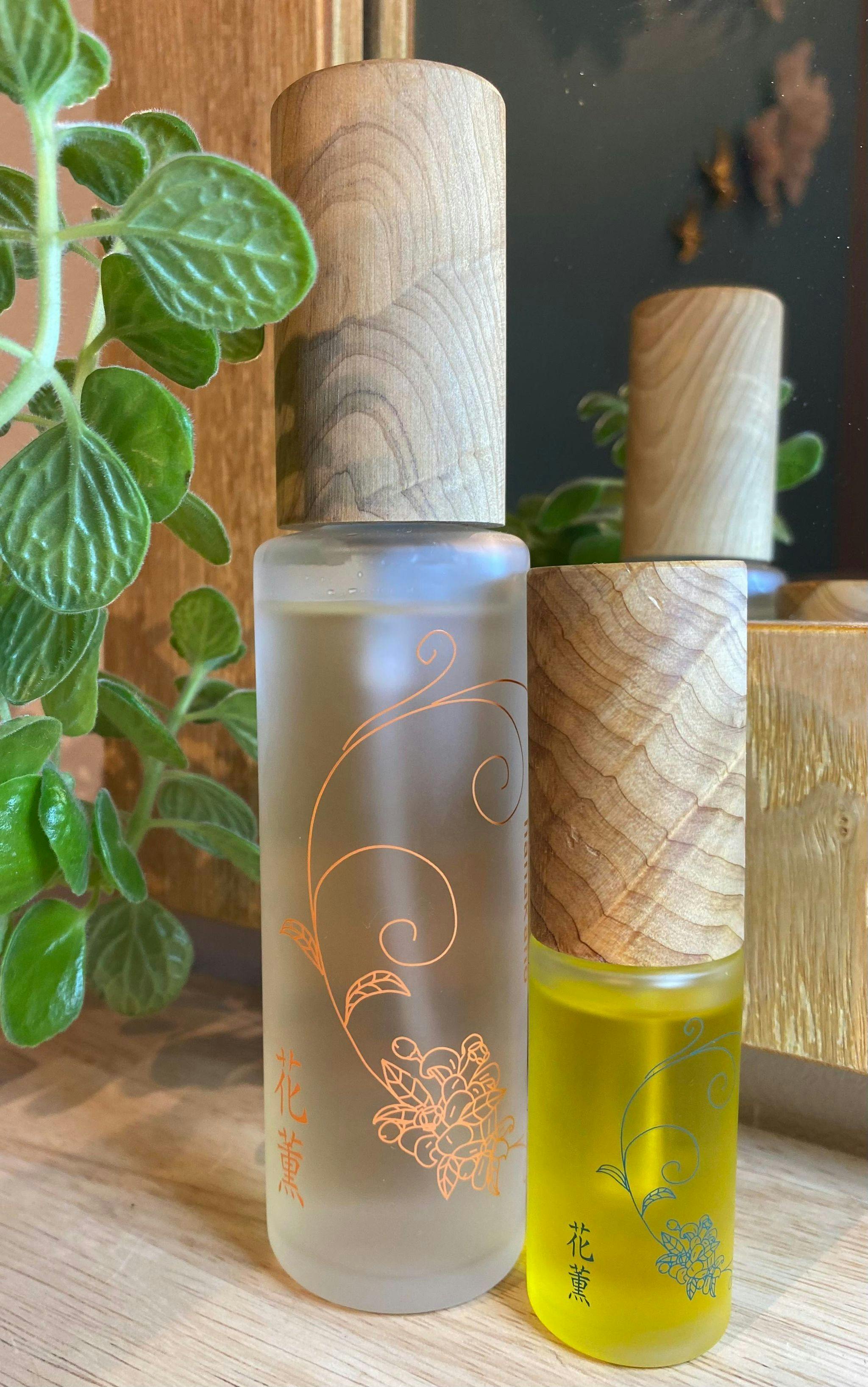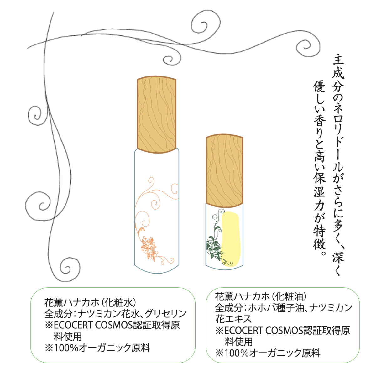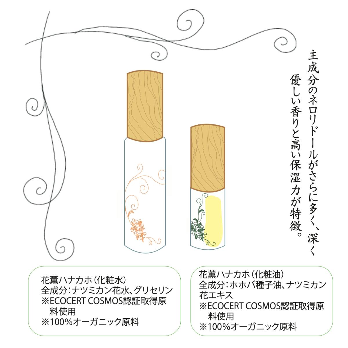 化粧水はネロリと熊本の名水を使った蒸留水を、化粧油はネロリ・蒸留水にホホバオイルを加えたものになっております。