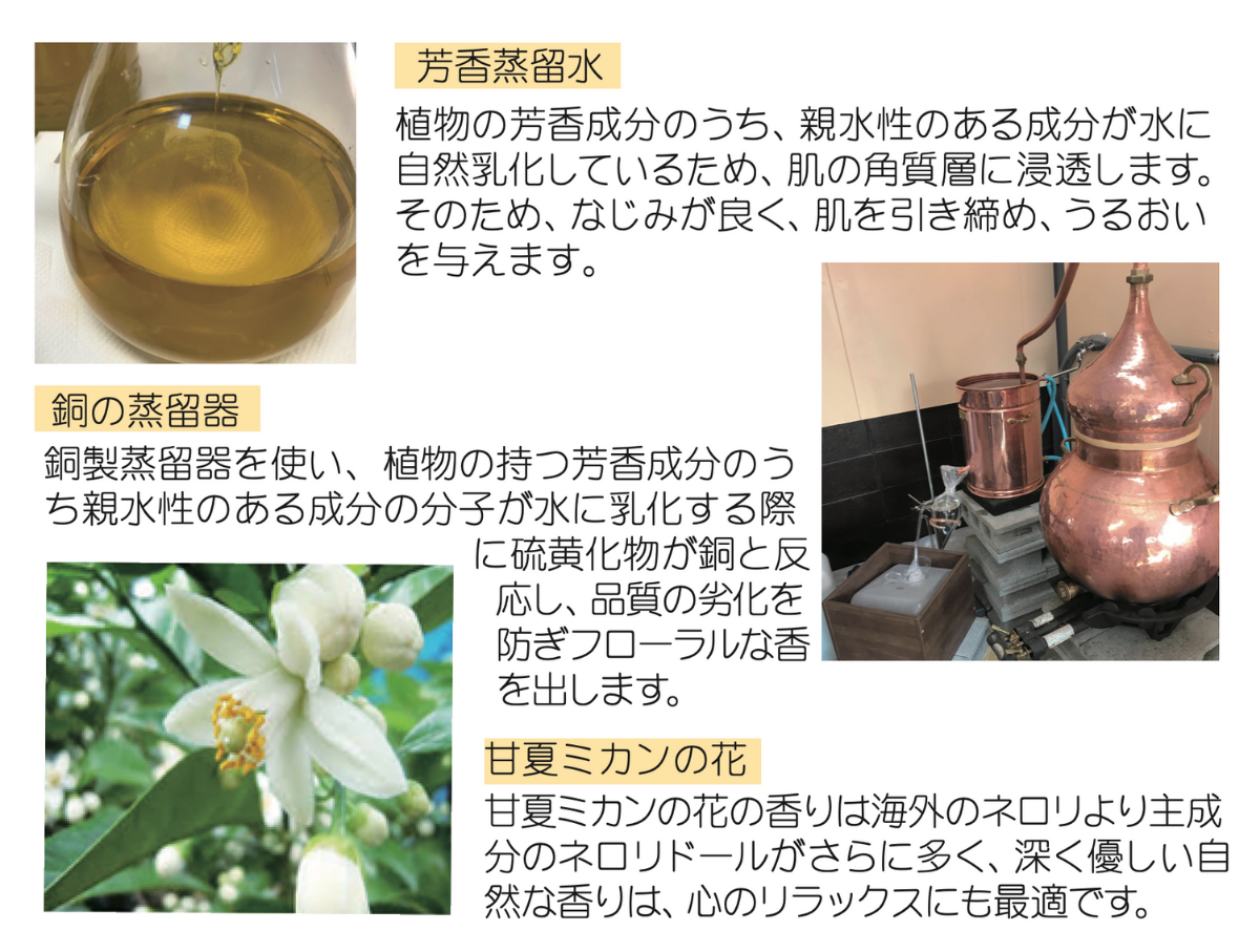 甘夏の花の芳香成分のうち、親水性のある成分が水に自然乳化しており、肌に浸透させることで内側から効果を発揮するためです。