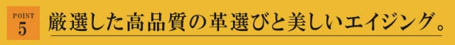 ニートフットオイルをたっぷり含んでおり使い込んでいくうちに熟成され、手触り・艶ともに増していきます。しっとりした手触りと高級感あふれる艶が特徴で私たちが選んだ熟成エイジングレザーの中でもより変化を楽しめる革だと思います。