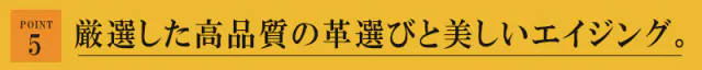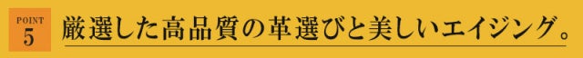 ニートフットオイルをたっぷり含んでおり使い込んでいくうちに熟成され、手触り・艶ともに増していきます。しっとりした手触りと高級感あふれる艶が特徴で私たちが選んだ熟成エイジングレザーの中でもより変化を楽しめる革だと思います。
