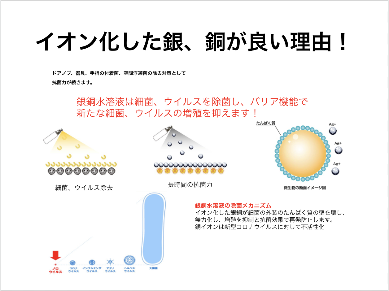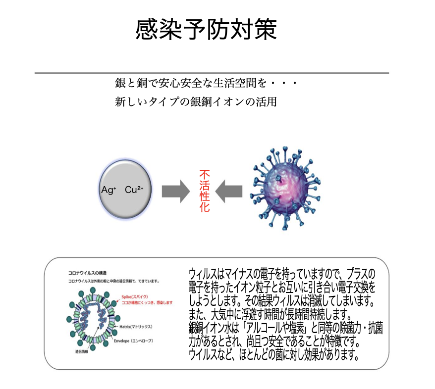 イオンとは、原子または分子が電子を放出するか受け取るかして電荷を帯びた状態のことを言います。このとき正(+)の電荷を持っていると陽イオン、負(-)の電荷を持っていると陰イオンと呼ばれます。銀銅イオンは正(+)の電荷を持ち、ウイルスは負(-)の電荷を持ってます。接触することで不活性化(死滅)します。