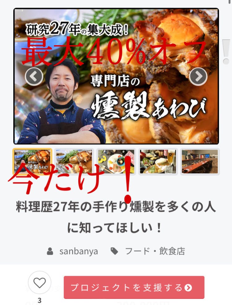 皆様!こんにちはお陰様で、順調ですご支援、ご協力、誠にありがとうございます!ついに、、30%達成しました!やっったーっ!!!!!挑戦はまだまだ、これからですが、とても、嬉しいです!めっちゃお得な燻製スペシャルセットを一番下にご用意しました!是非是非、ご覧下さい!それでは、まだまだ、頑張ります!美味しい燻製アワビ‼日本中へ広がれ〜‼︎‼︎これからも宜しくお願い致します!