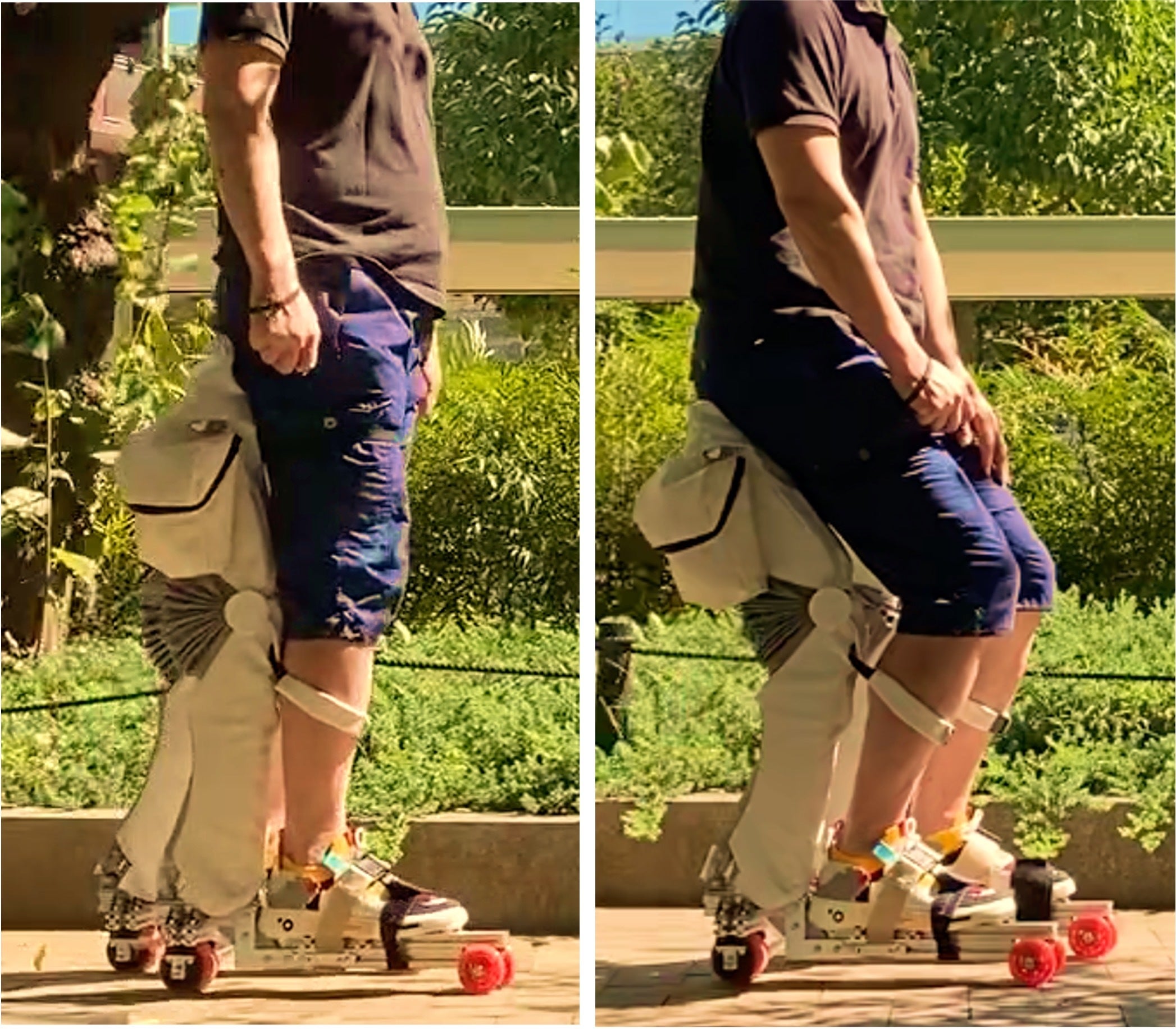 セグウェイや電動キックボードなど従来の小型パーソナルモビリティの多くは立ち乗りですが、レジャーやスポーツ用ではなく移動手段として使用するならばユーザの負担軽減が必要と考え、MOBILE WEAR はstanding mode(下図左)で立ち乗り移動の軽快性を、sitting mode(下図右)で座り姿勢移動の快適性を提供します。