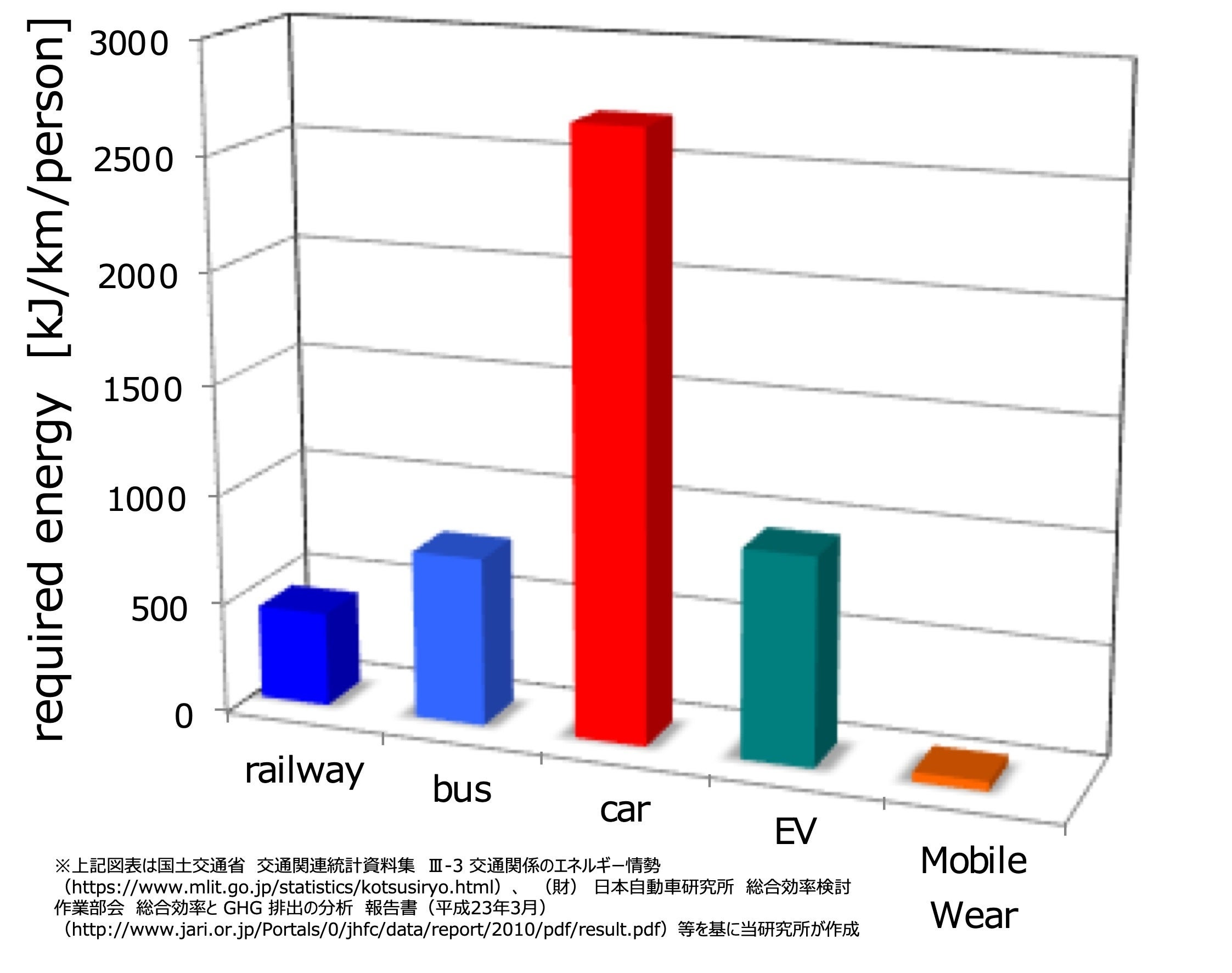 MOBILE WEARが移動に費やすエネルギーはとても小さく(クルマの数十分の1)、