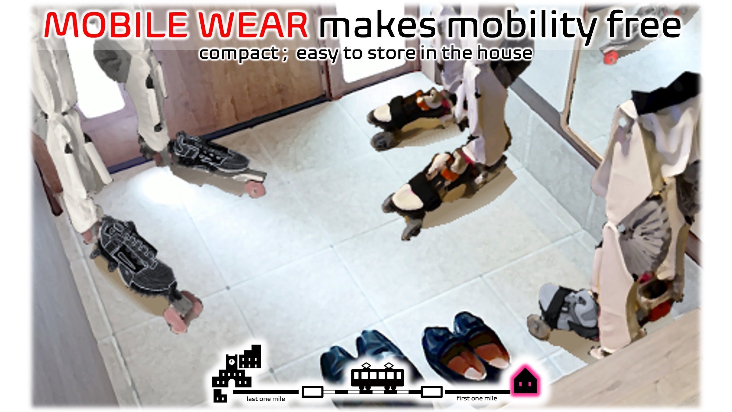 MOBILE WEARはコンパクトなので保管のために車庫や特別な収納は不要。靴と一緒に玄関に置き、外出時はそのまま身につけて出発できます。
