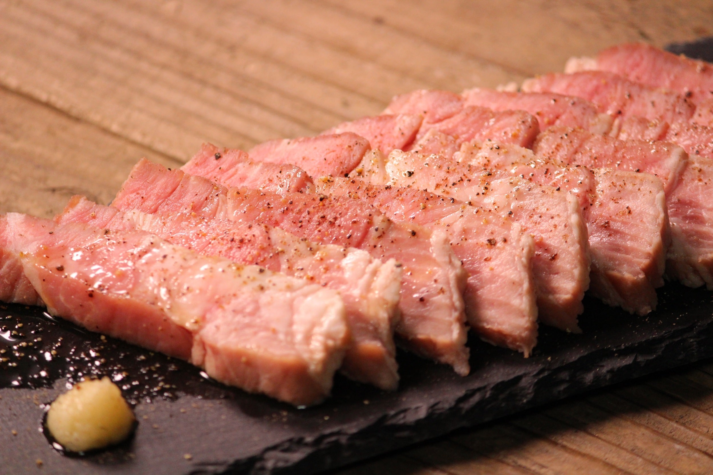 北海道産豚肉の肩ロースを使用した、豚肉の脂の甘みと肉の旨味を感じるローストポークです。こちらもごま油とおろしニンニクで肉刺しのように召し上がるのがオススメ。