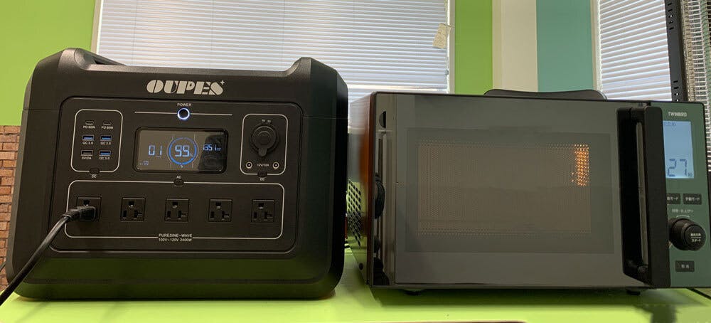 OUPES 2400は、バッテリー容量2232Wです。計算上は700Wの電子レンジを約1時間30分前後使用可能です。