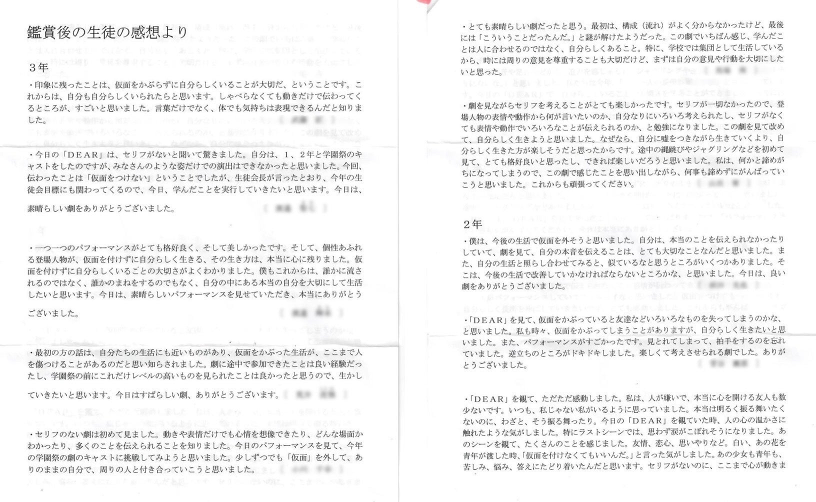 2022/12/31 18:23【ご報告 児童福祉文化財に選定いただきました】皆様にご支援いただきました『DEAR-ウソつきの私-』が令和4年度【児童福祉文化財】に選定されました!児童福祉文化財とは厚生労働省の審議会が舞台芸術や映画、図書など各分野の学識経験者のある方々が審査を行い毎年作品を選定しているものです。(昨年度は舞台芸術では演劇で2つの作品が選定されています)今作『DEAR』は子どもたちはもちろん、中学生以上や一般、啓発の部門でも審査をしていただきました。70年以上続く歴史のある文化財にこの作品を評価していただき選定していただいたのも本当に嬉しかったですし今まで出会ってきた子どもたちの顔も浮かび言葉にならない想いでいっぱいでした。セリフなしのノンバーバルで伝える演劇とサーカスのストーリー。数年前の初演、0からのクリエイション。大変な状況でも脚本や演出にずっと一緒についてきてくれて一緒に作品を創り、届け続けてきたキャスト・スタッフチーム。今年の5月の一般公演にあたりクラウドファンディングにご協力いただいた皆様。劇場にご来場いただいた皆様、並びに関係者の皆様。そして、今まで全国で舞台を見てくれた皆様…。今まで『DEAR』を一緒に創り上げてくださったすべての皆さんのおかげです。感謝の言葉ではいいつくせません。本当に、ありがとうございました。これからも沢山の方にこの作品のメッセージが届け続けていけますように…。心からの感謝を込めて。【DEAR】脚本・演出 MIYUならびにプロジェクトメンバー一同 もっと見る